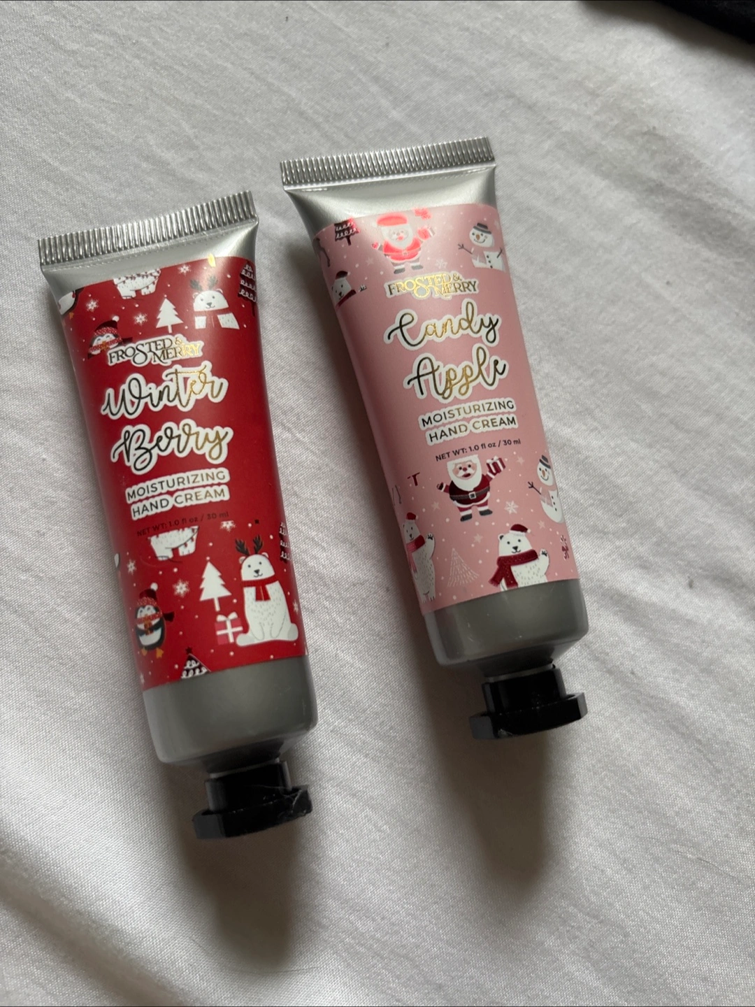 Two tubes of hand cream. They are colourful and decorated with a wintery theme. Perfect for moisturizing your hands before bed for a peaceful sleep. Unopened