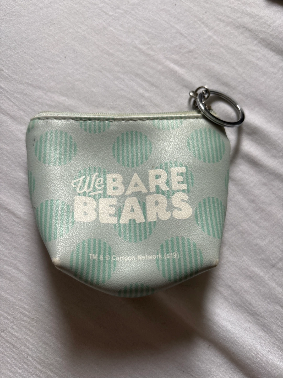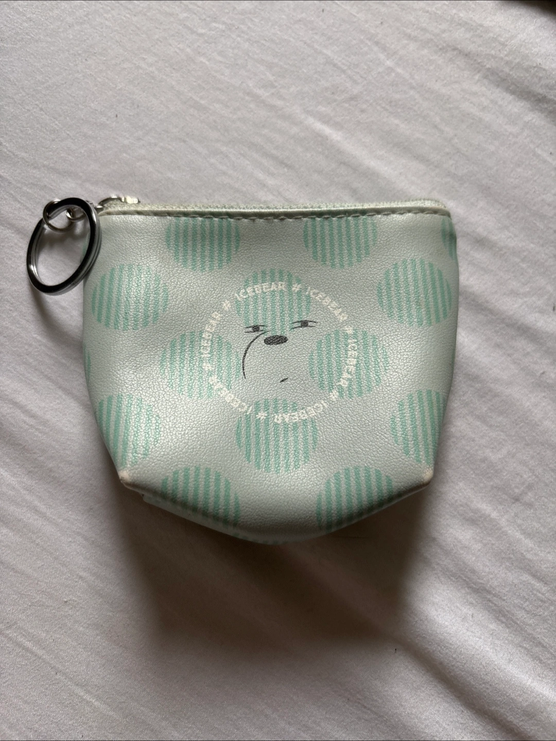 Small coin purse with a zipper. Features a pattern and imagery from the We Bare Bears cartoon. A great place to hold your change or small treasures.