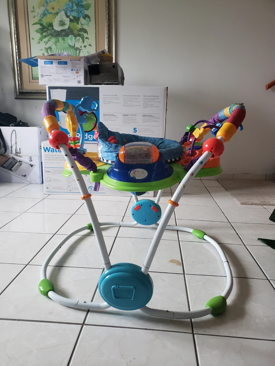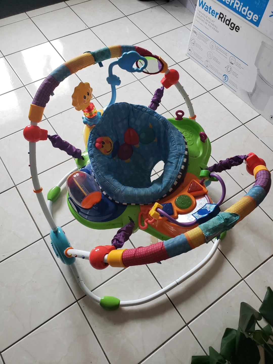 Colorful baby jumper. Several interactive toys. Encourages development. Perfect for keeping your baby entertained while you relax.