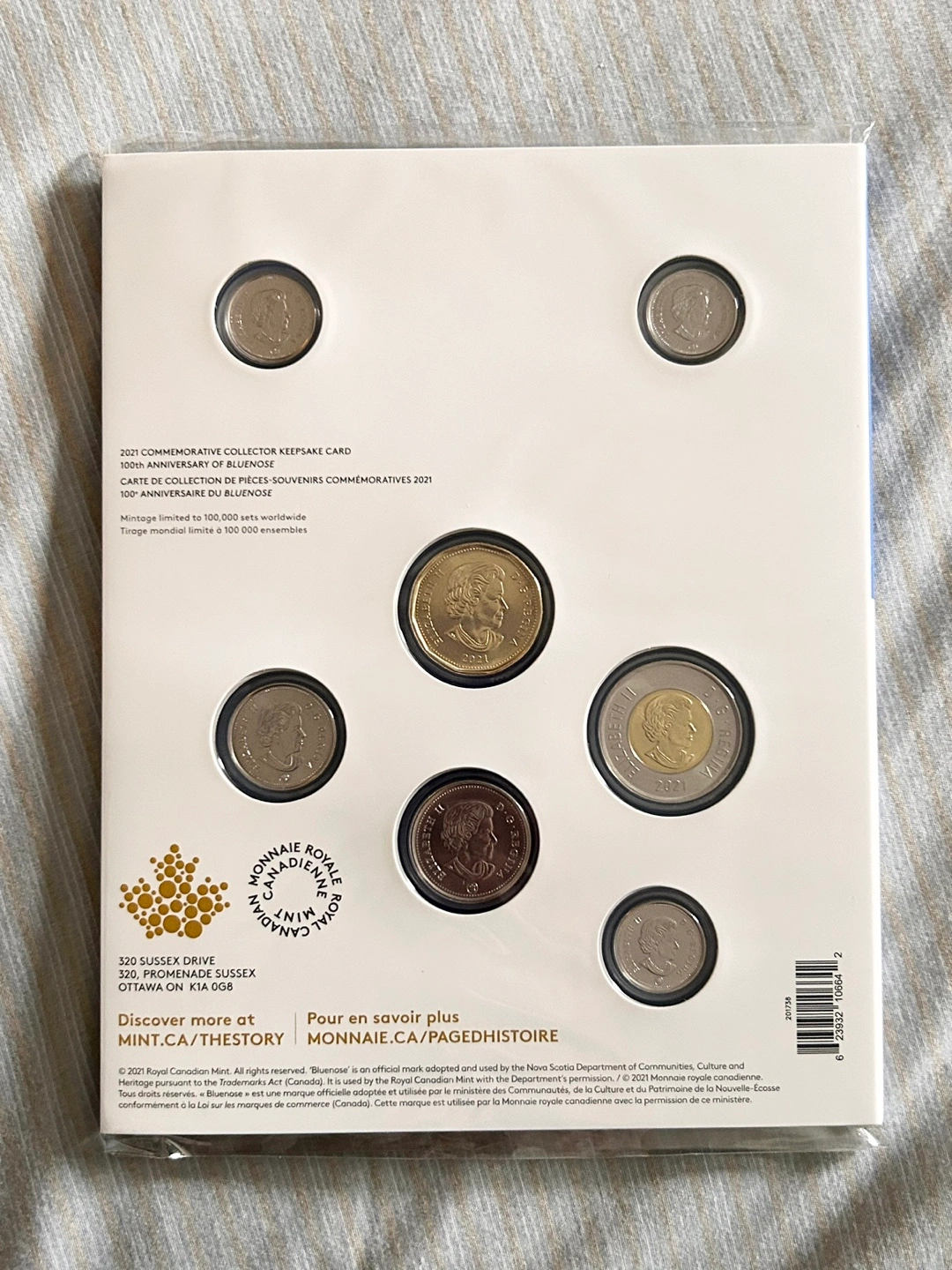 A wonderful item for coin collectors. Commemorative collector keepsake card. Features a set of coins. The Bluenose design is visible.