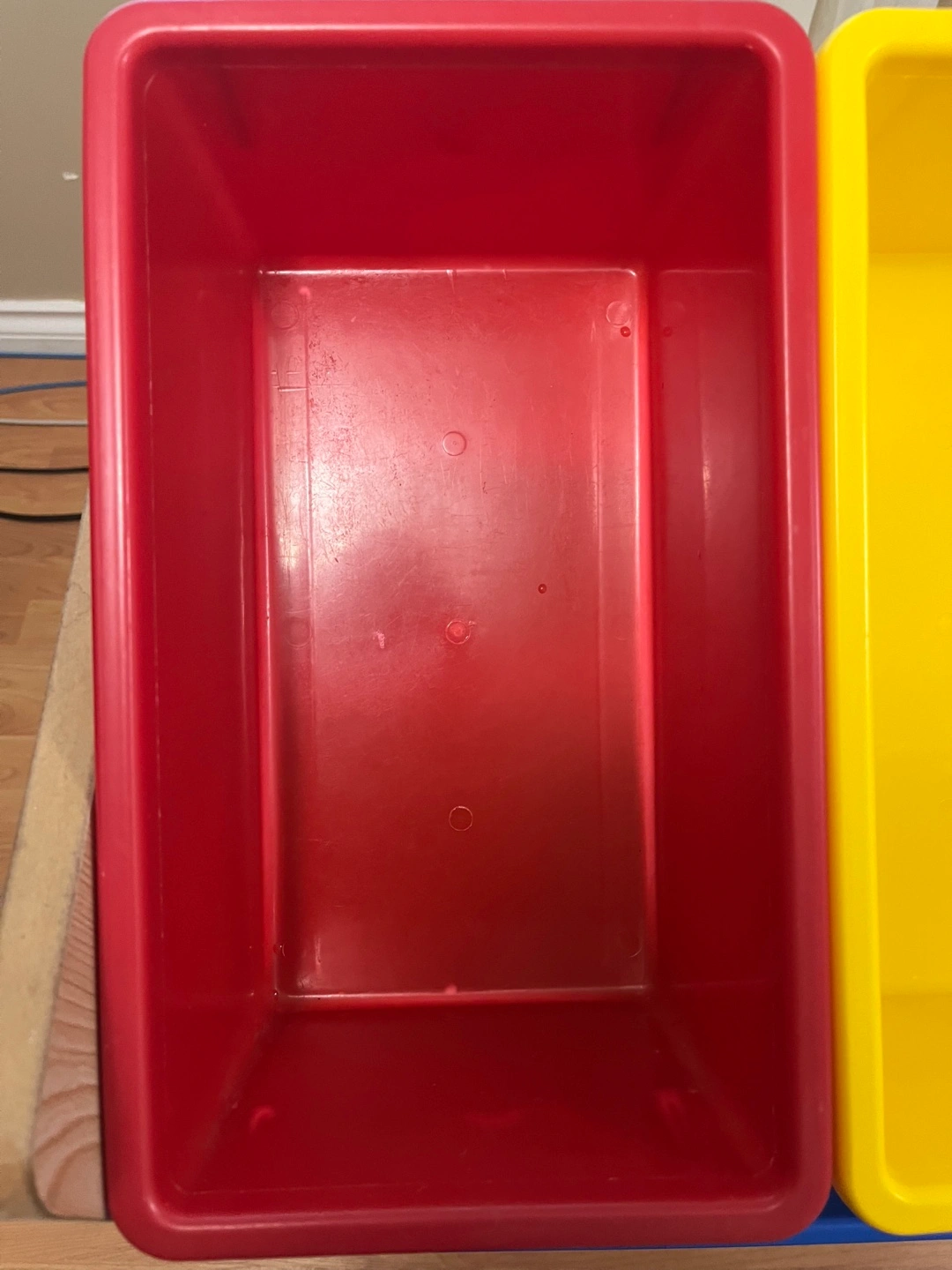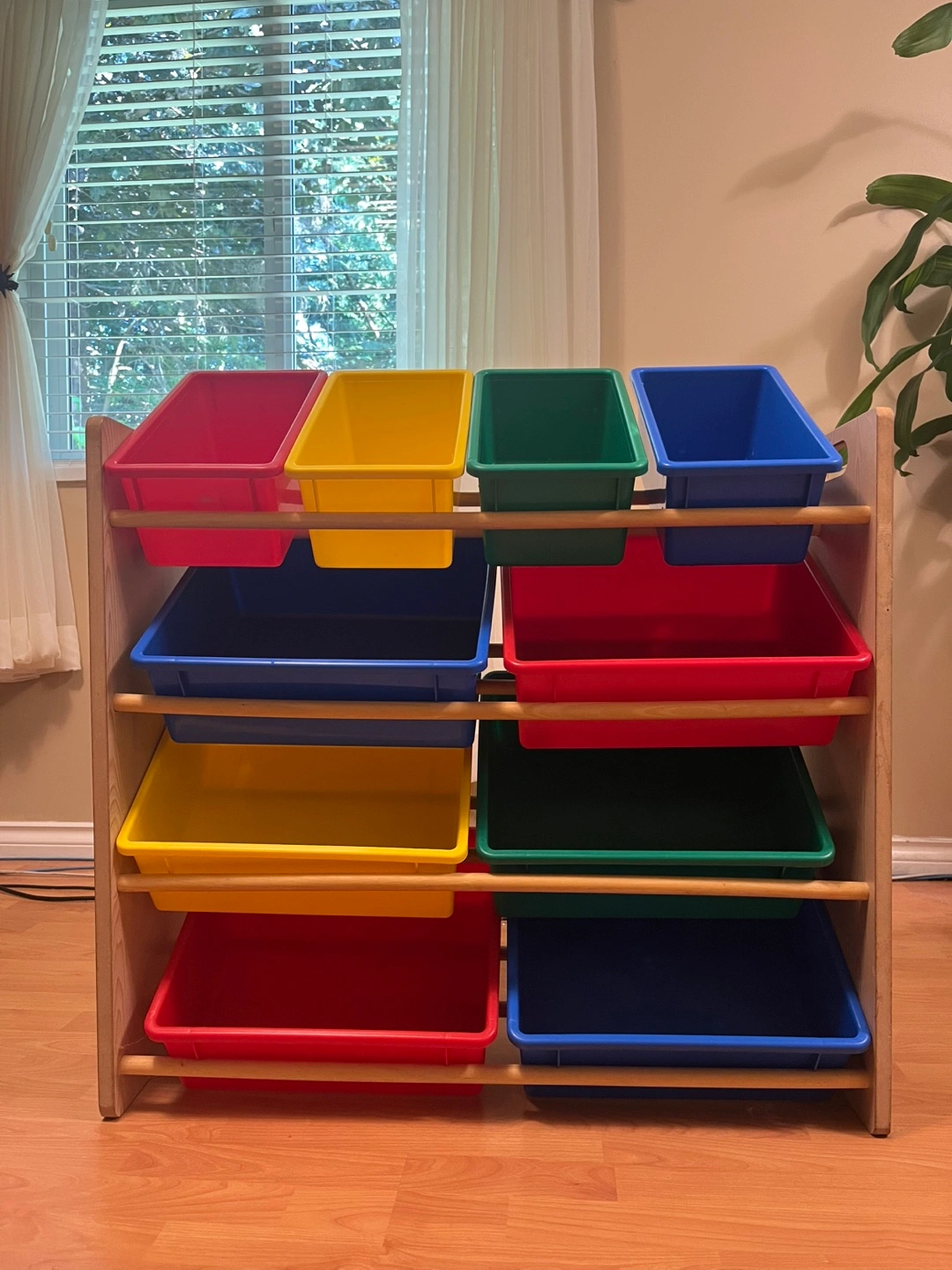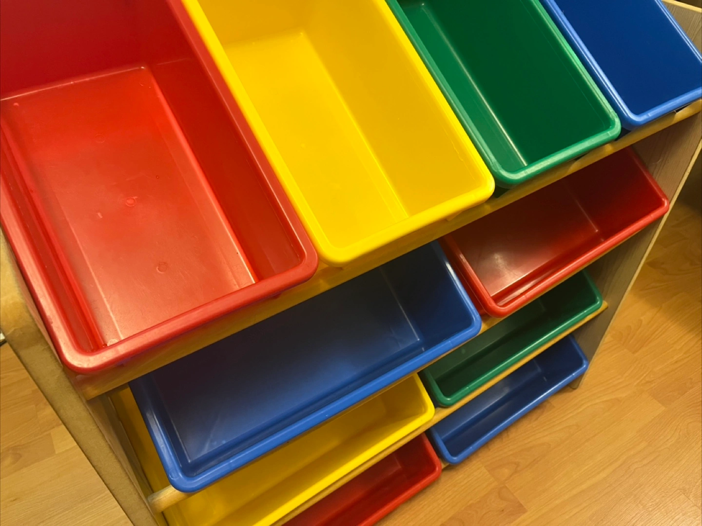 A wooden framed storage unit. Includes multiple coloured bins. Perfect for keeping toys organized, creating a soothing atmosphere.