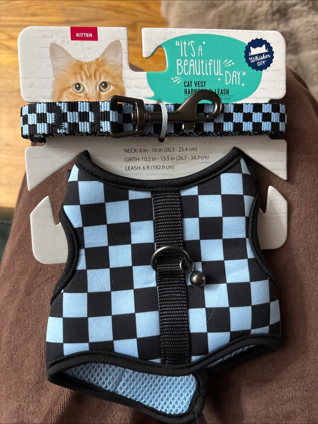 Checkered cat harness and leash set. The set has a vest, leash and collar with a checkered design in black and light blue. It would be a great addition for your cat's daily walks. Tried it on my cat once and its too small for her.