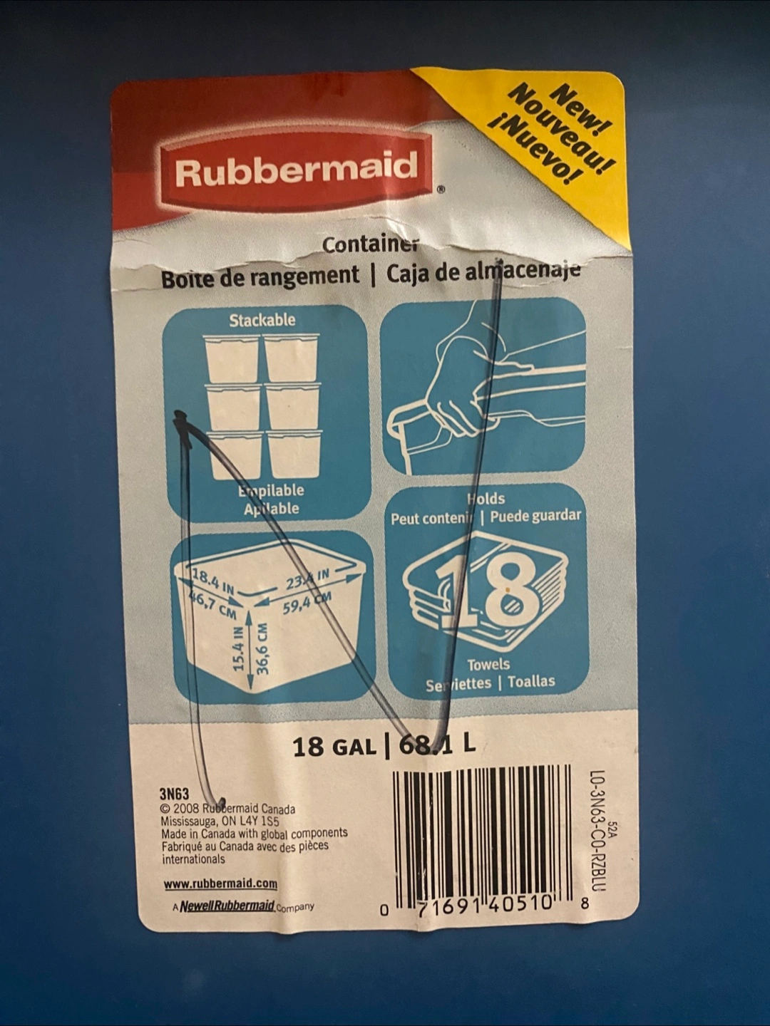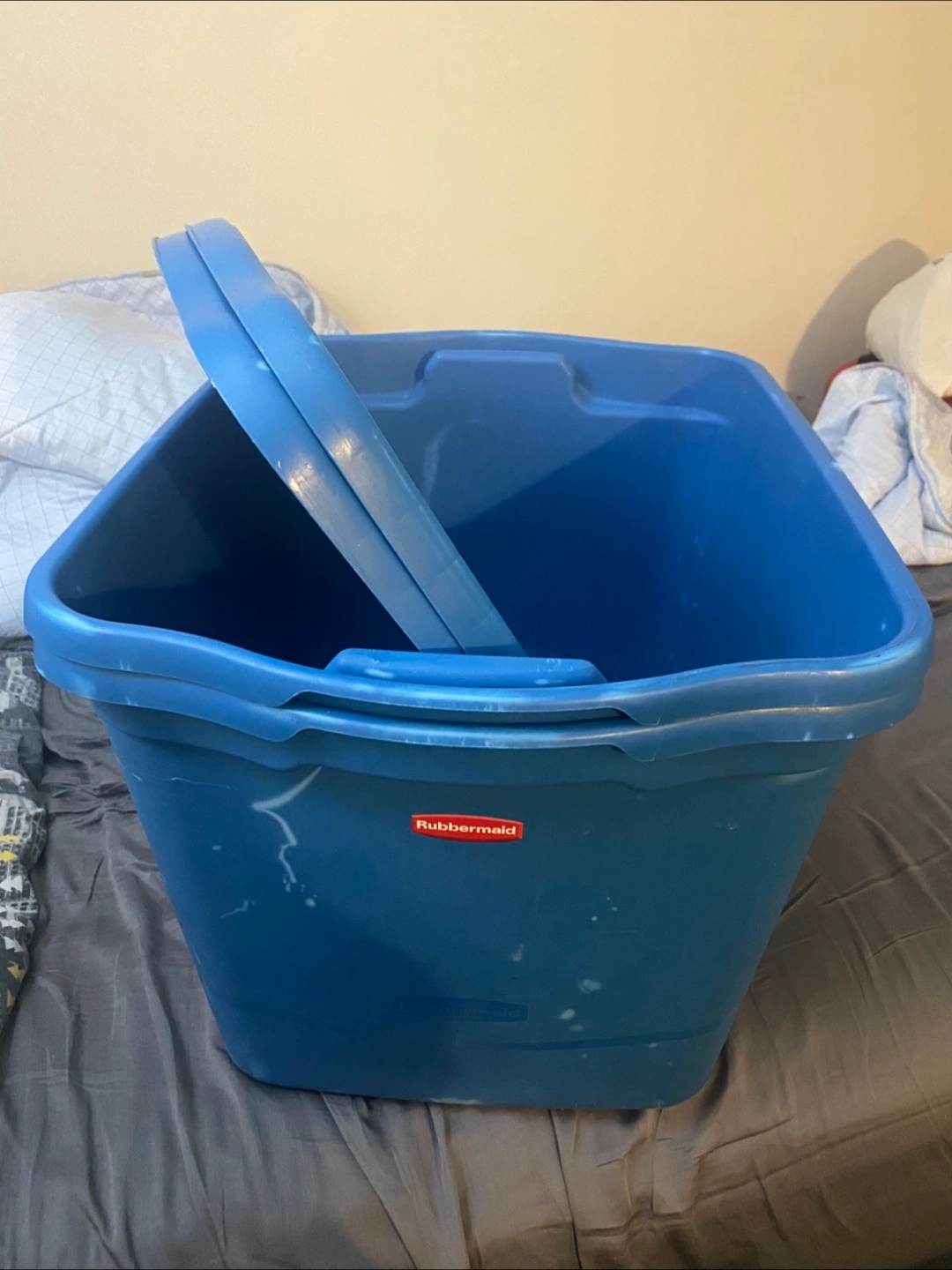 2 Blue containers. Come with a lid. Ideal for organizing any clutter in your home. $5 each Made of low density polyethylene Comfortable handles for portability Capacity: 68.1 L Dimensions: 24 x 16 x 16½" (61 x 41 x 42 cm) Colour: Blue