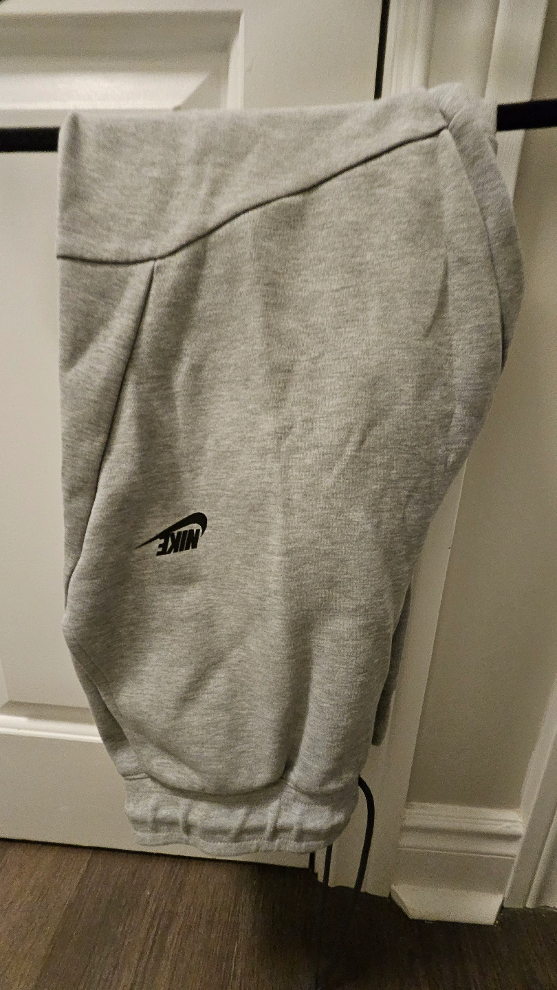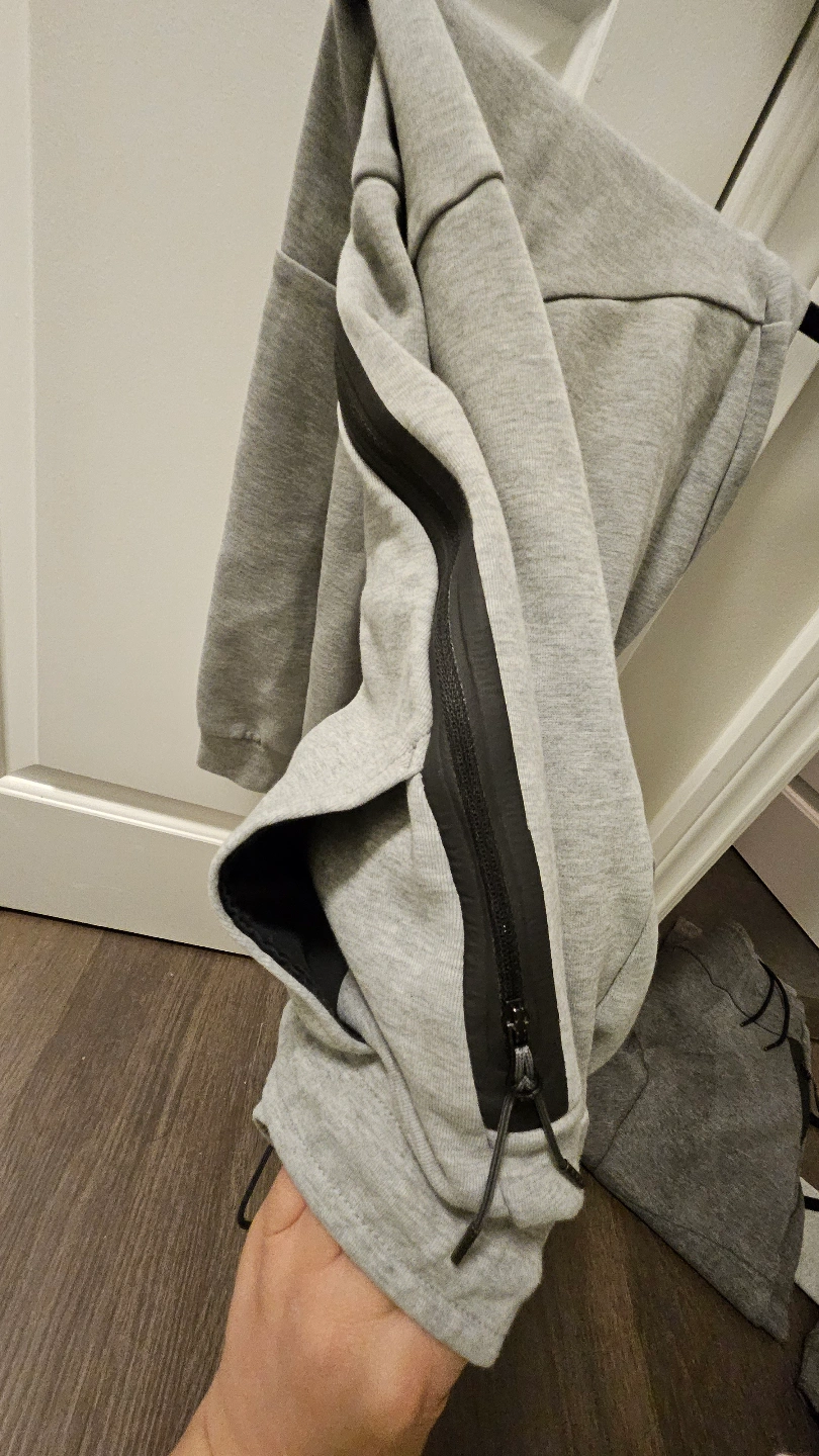 Grey sweatpants. A simple design. Made with pockets and zippers. Would be perfect for a relaxing evening in.