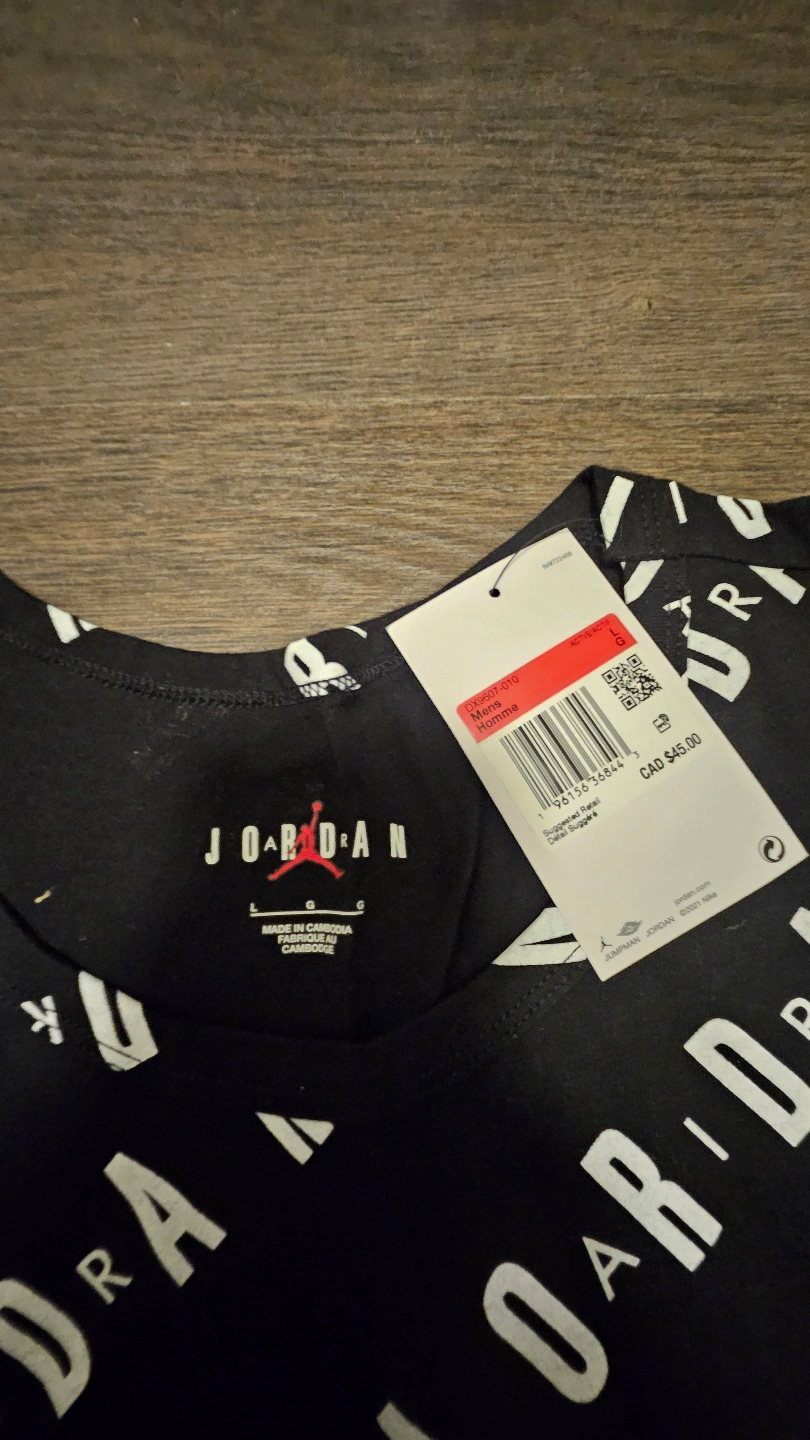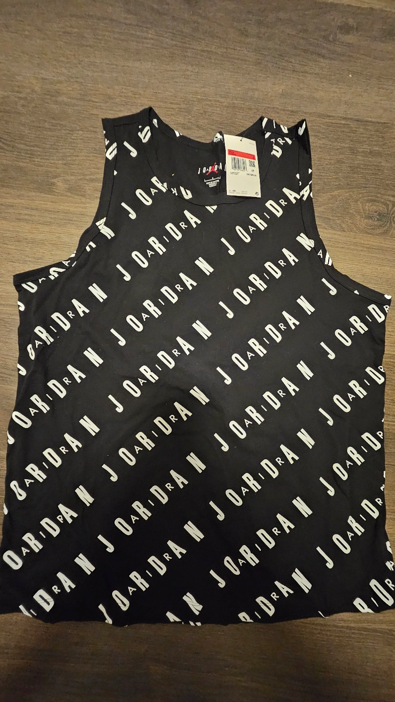 Black tank top. White Jordan text pattern. A great piece of clothing for comfortable everyday wear.