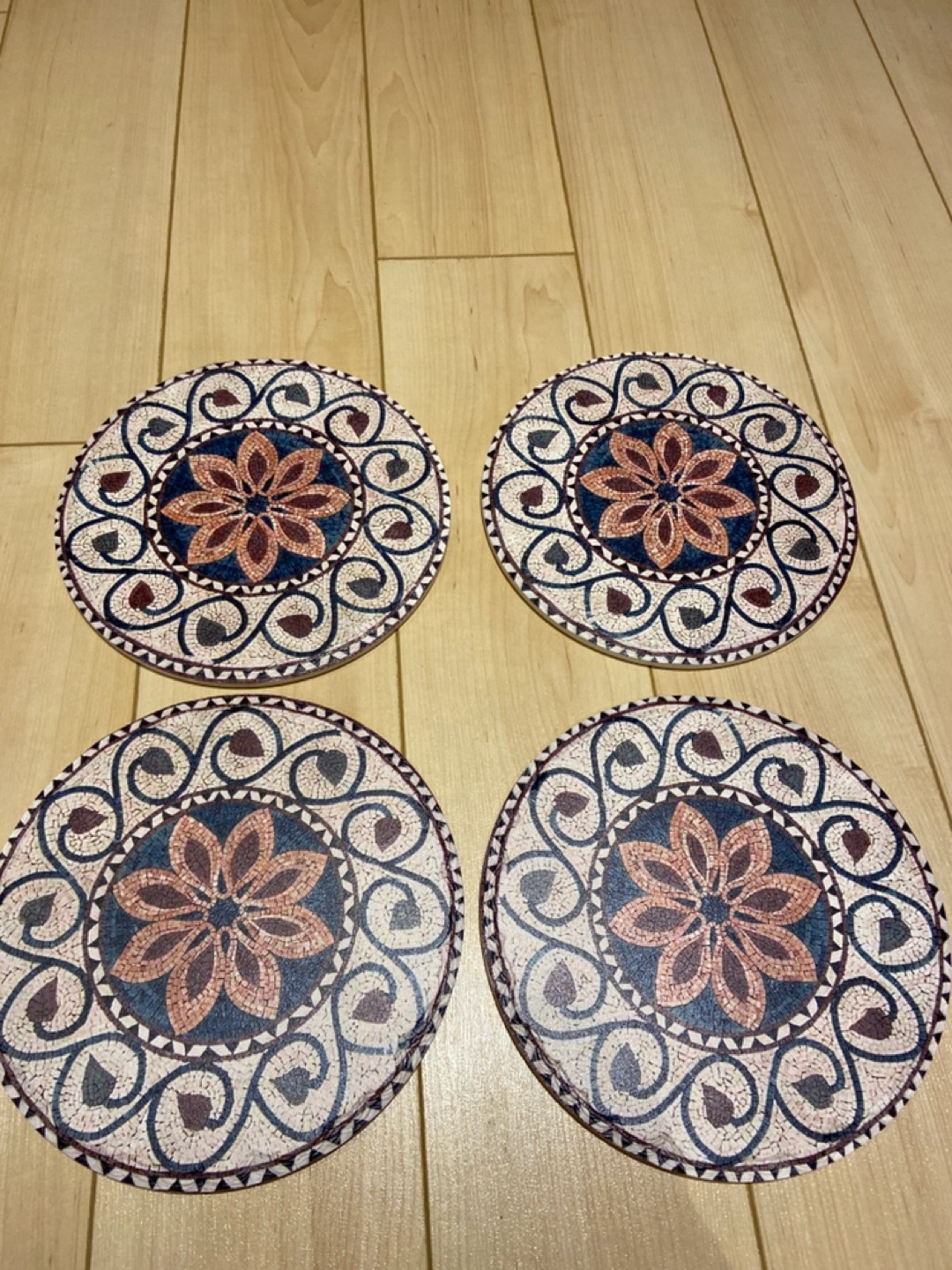 Round coasters with floral designs and cork back for pot or dish. Protect tables and tablecloths from ugly heat stains. Never used, extra and no need