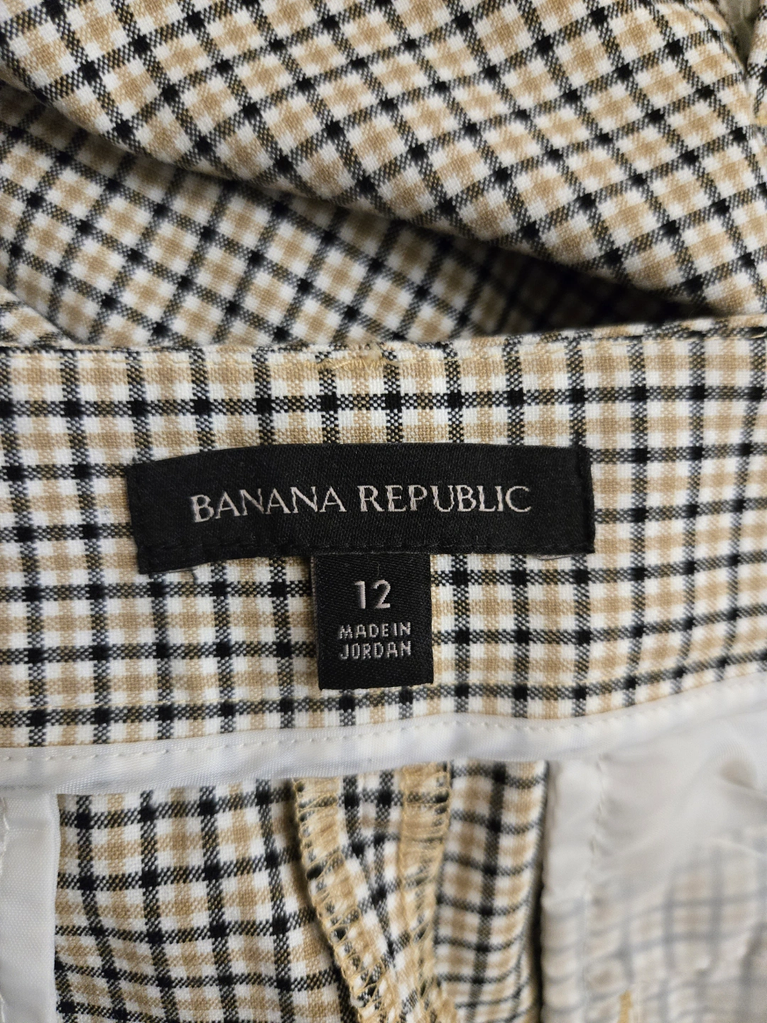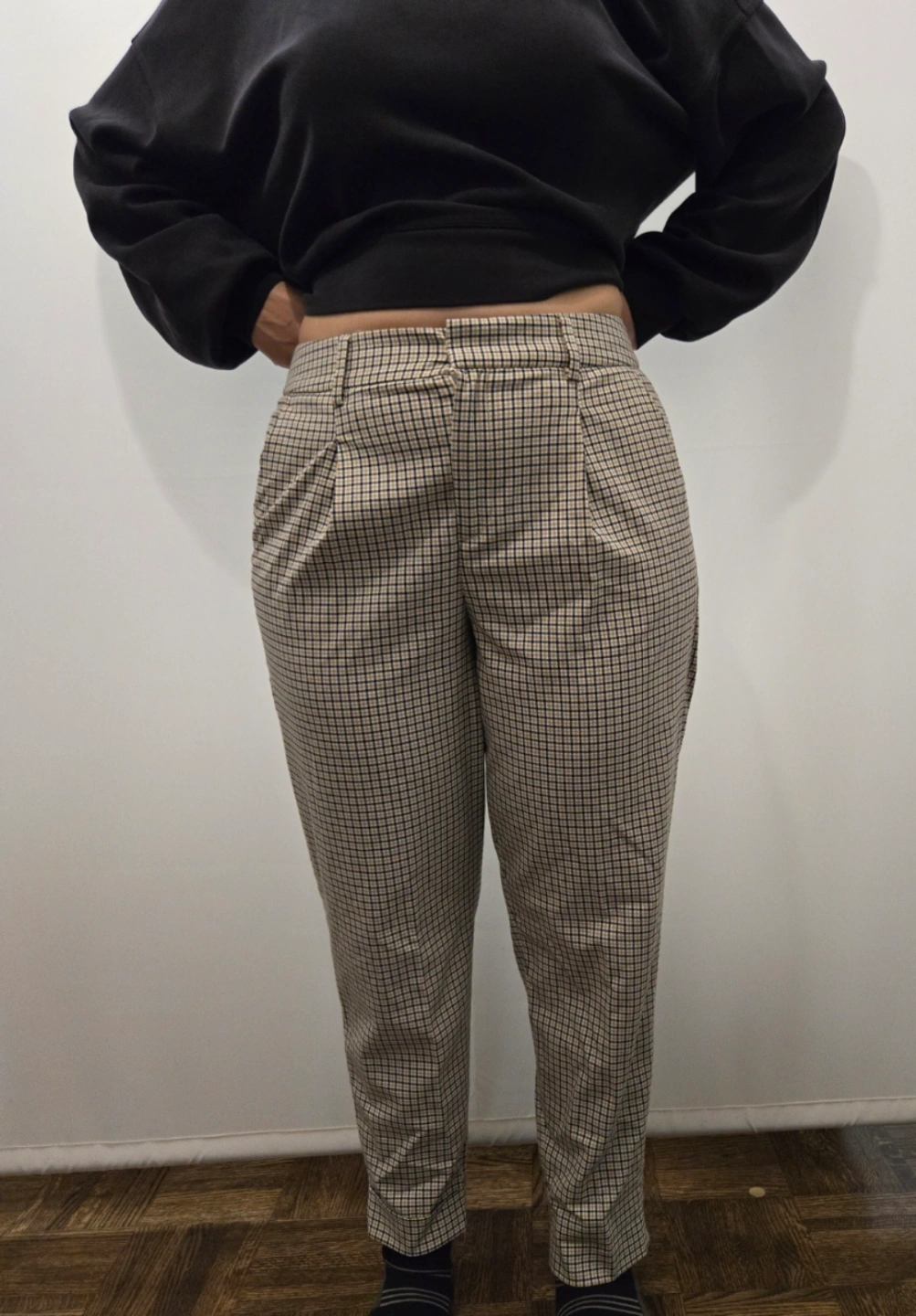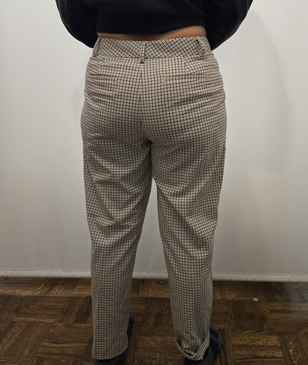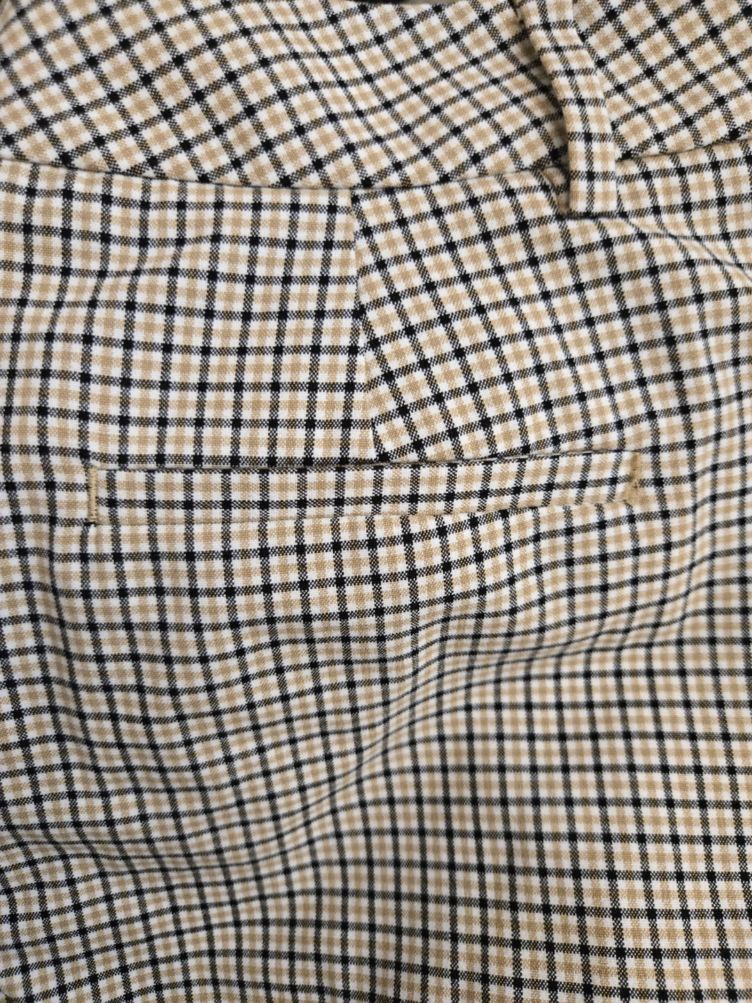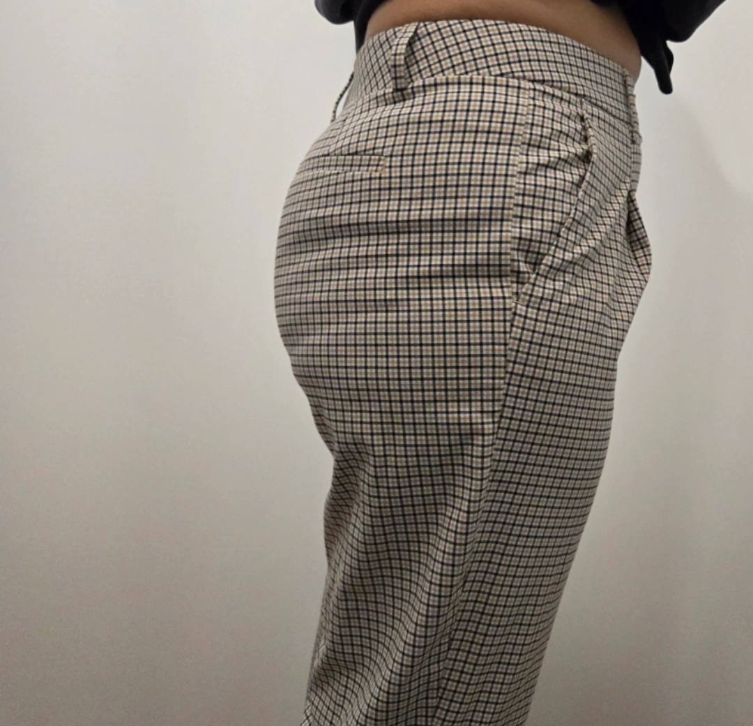 Plaid trousers in a neutral colour scheme. High waisted design. Has pleats at the front. A great item to wear while taking a relaxing walk. Made in Jordan. 2 slash front pockets and 2 back pockets. It is a polyester and spandex blend and is machine washable. It is in excellent pre-owned condition. 190$ in retail which can go on sale upto $60 ( I have a summer discount for Jun only and since only worn this once the price is firm $40)
