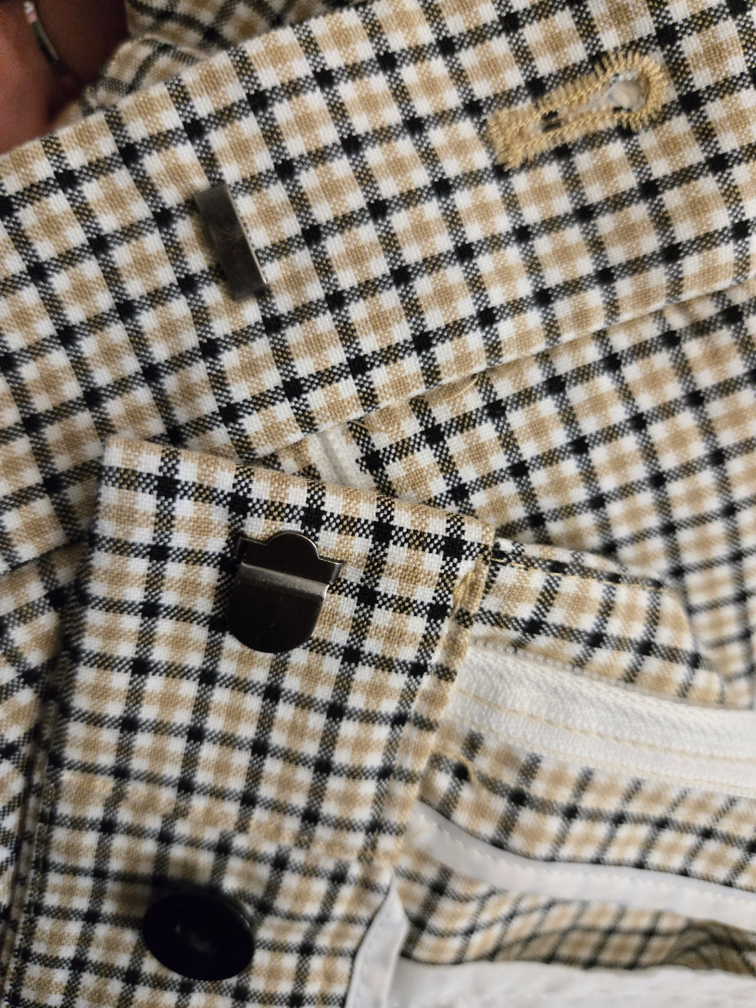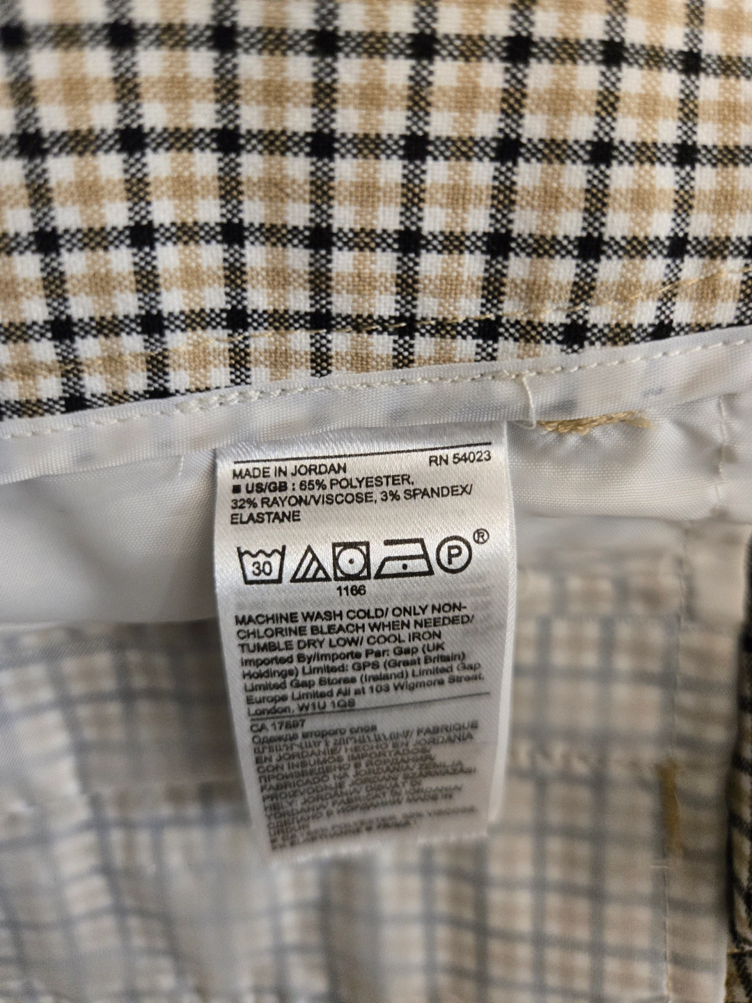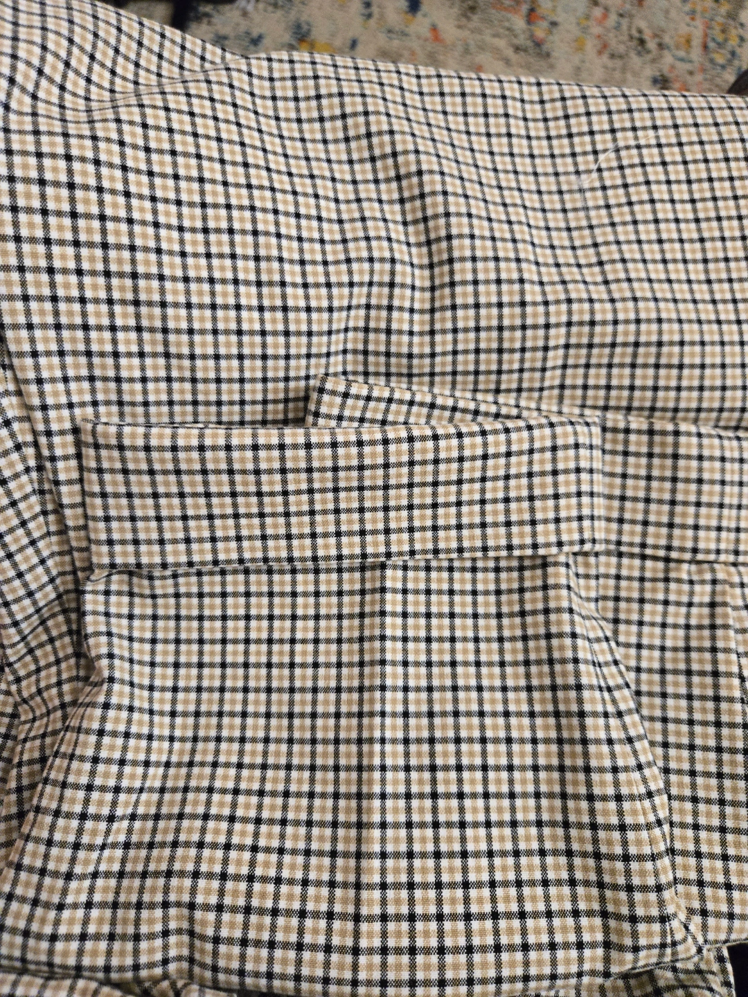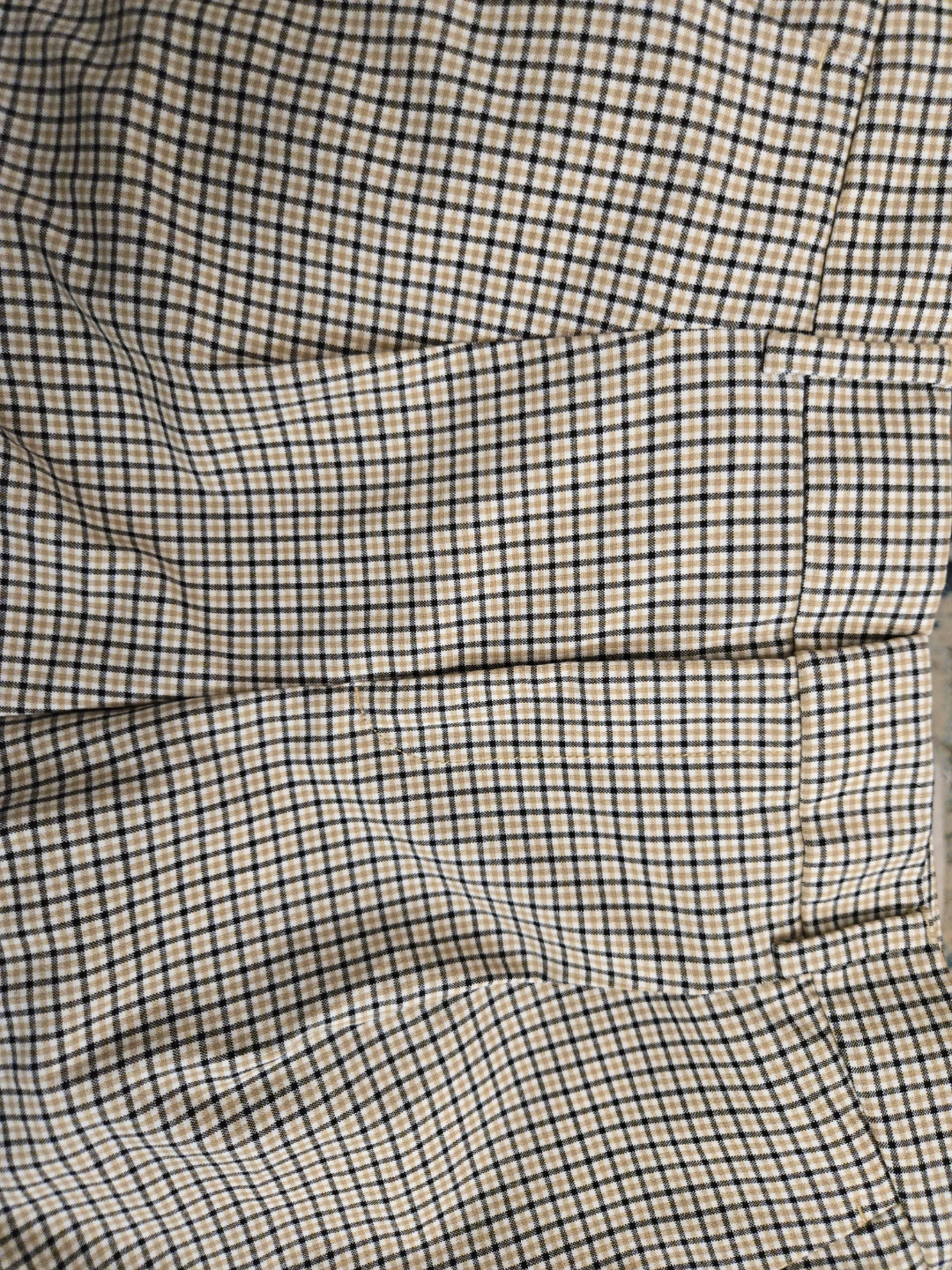 Plaid trousers in a neutral colour scheme. High waisted design. Has pleats at the front. A great item to wear while taking a relaxing walk. Made in Jordan. 2 slash front pockets and 2 back pockets. It is a polyester and spandex blend and is machine washable. It is in excellent pre-owned condition. 190$ in retail which can go on sale upto $60 ( I have a summer discount for Jun only and since only worn this once the price is firm $40)