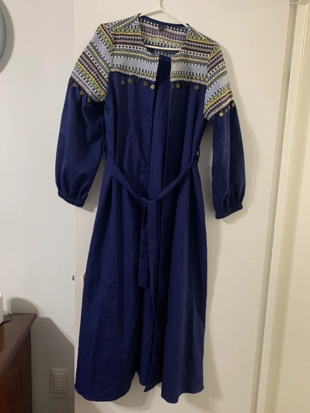 Long sleeve dress with a tie at the waist. Features embroidered pattern around the shoulders and sleeves, with a few round golden ornaments. A perfect addition to any wardrobe for a stylish and comfortable touch.