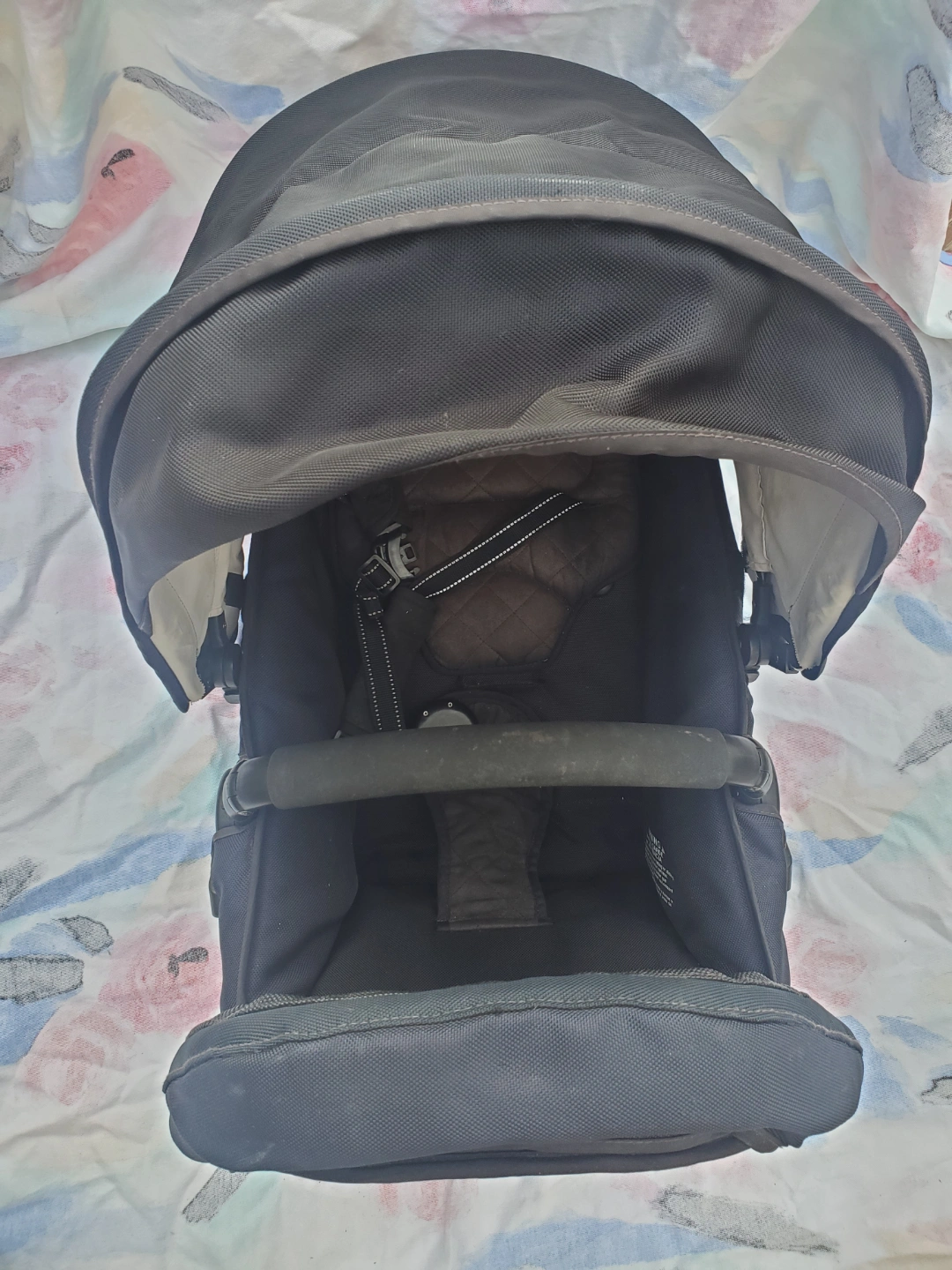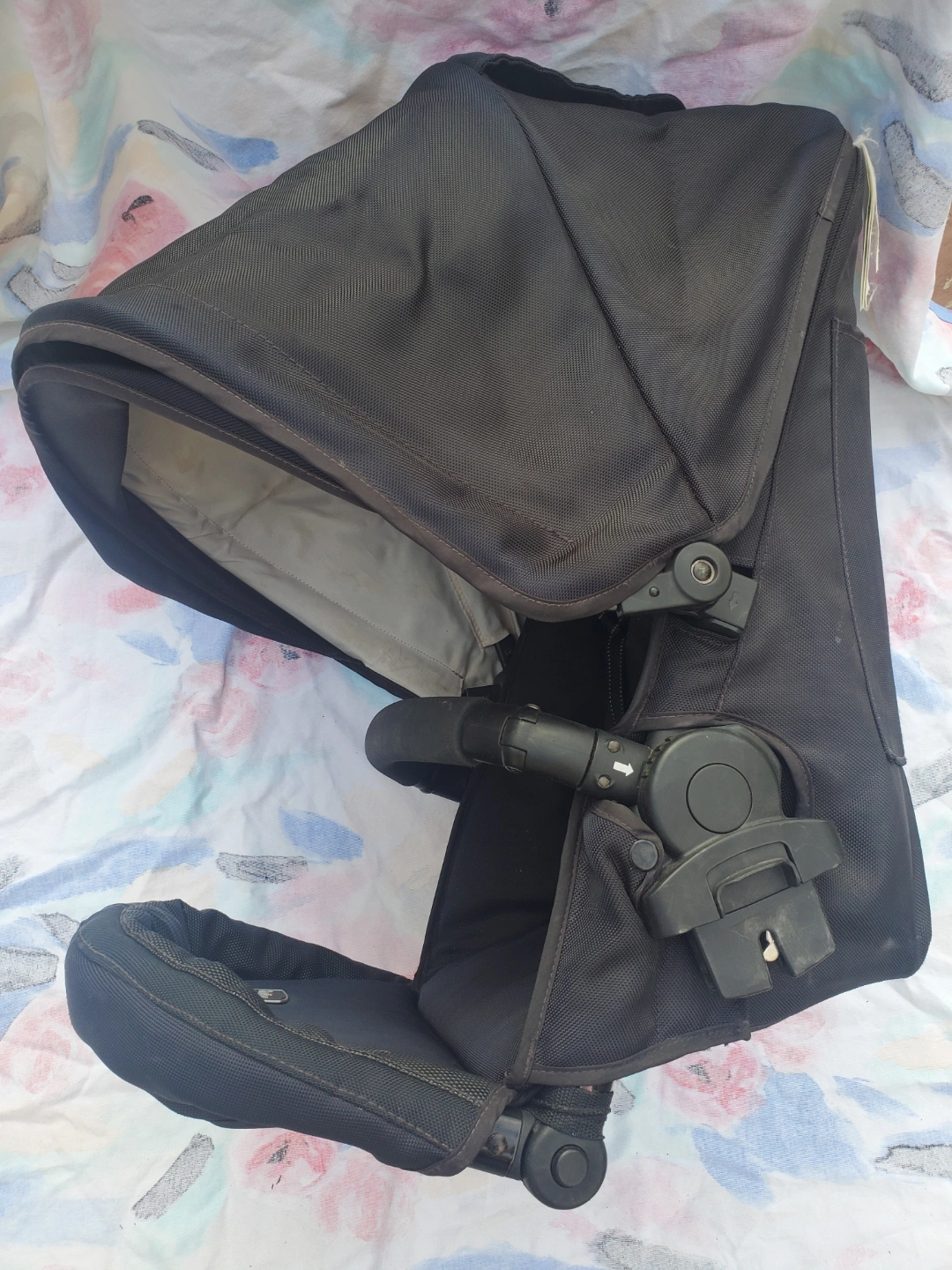 Dark-coloured stroller seat. Features a canopy, padded seat and handle bar. Offers a comfortable space for your little one. Appleby and New Street area Porch Pick up Cross-posted