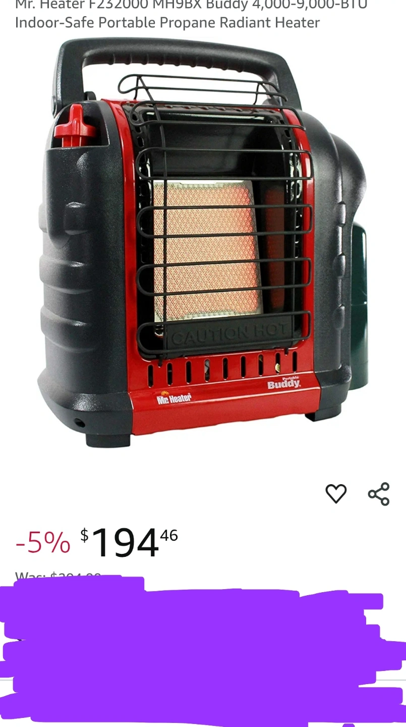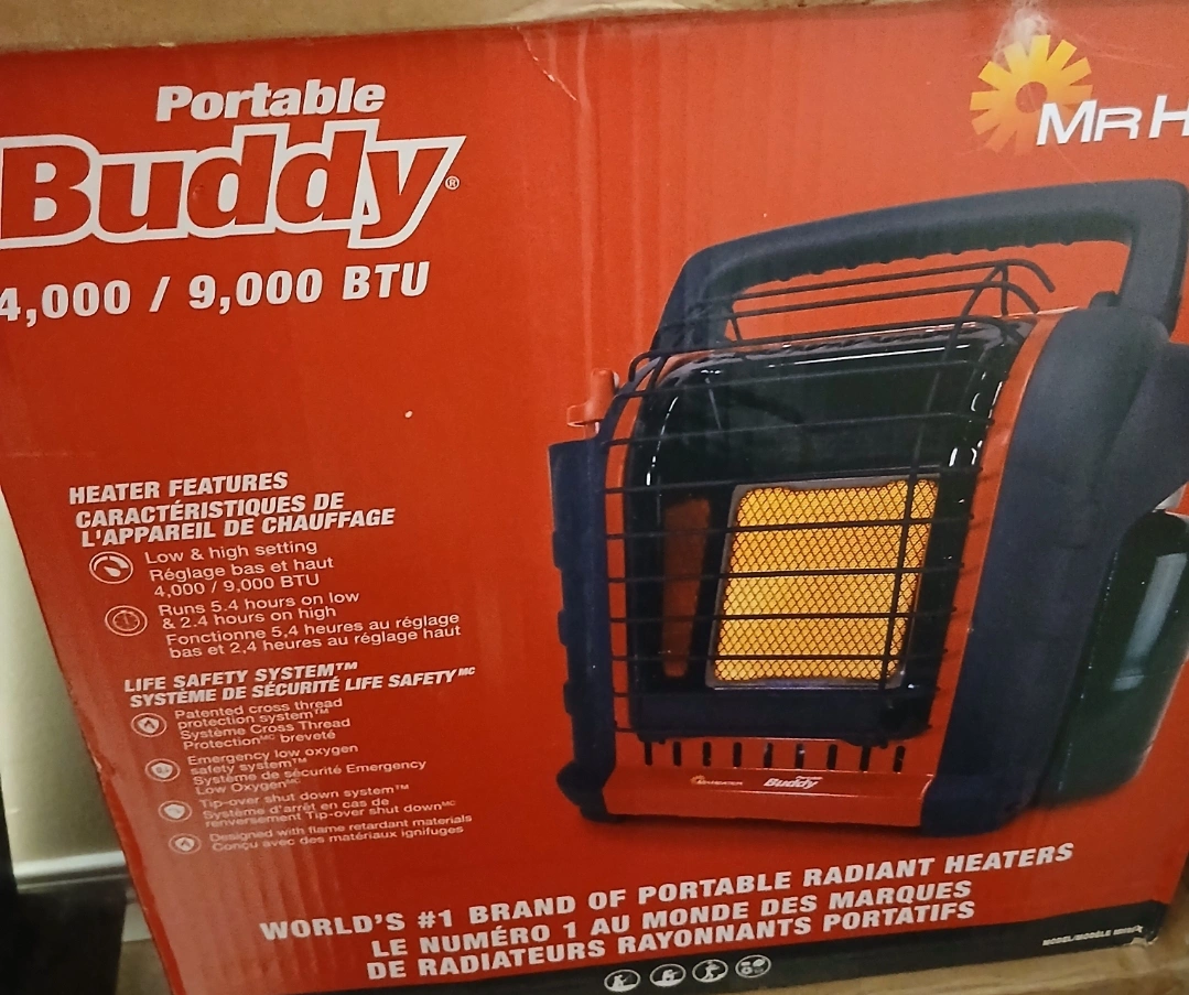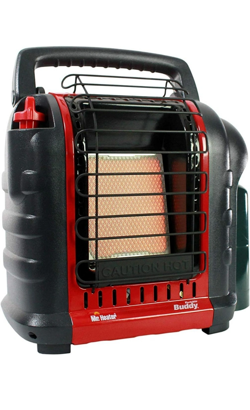 Black and red portable heater. Handle on top for carrying. Safety grill on the front. A nice item to keep you warm during cold evenings.