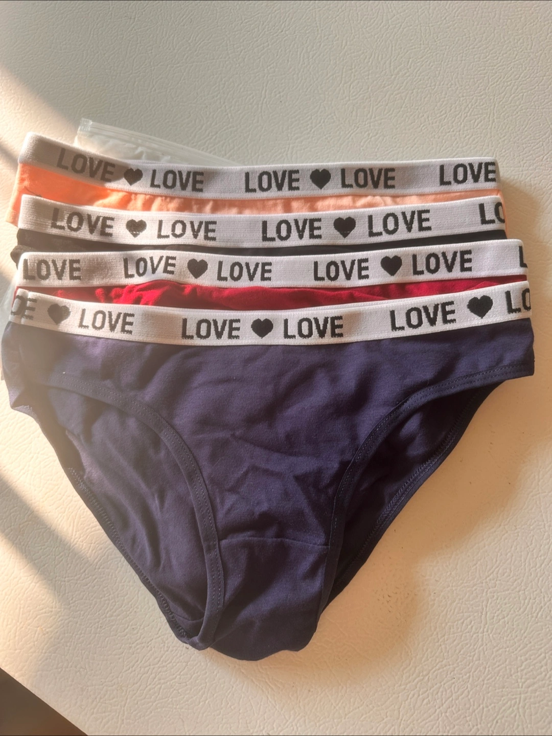 Underwear in various colours. With the word LOVE printed on the waistband. Packaged in a clear plastic bag. These comfy pairs of underwear will make a great addition to any wardrobe.