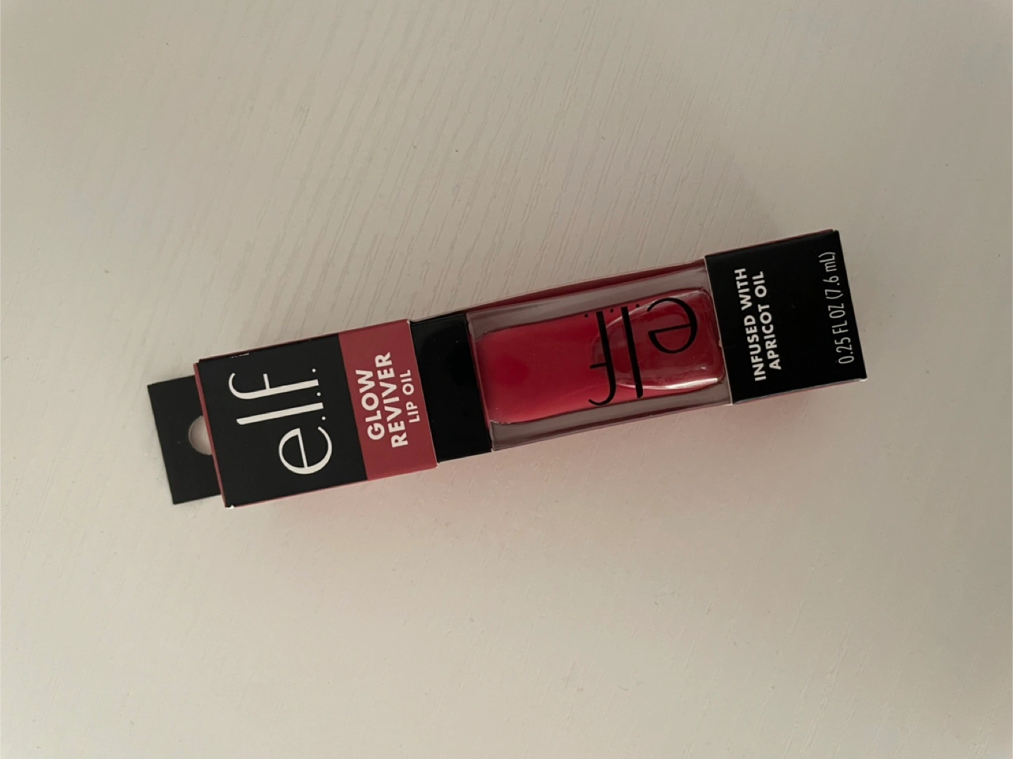 A lip oil with a red tint. It comes in a clear container. It appears to be infused with apricot oil. Apply this lip oil for a little self-care.