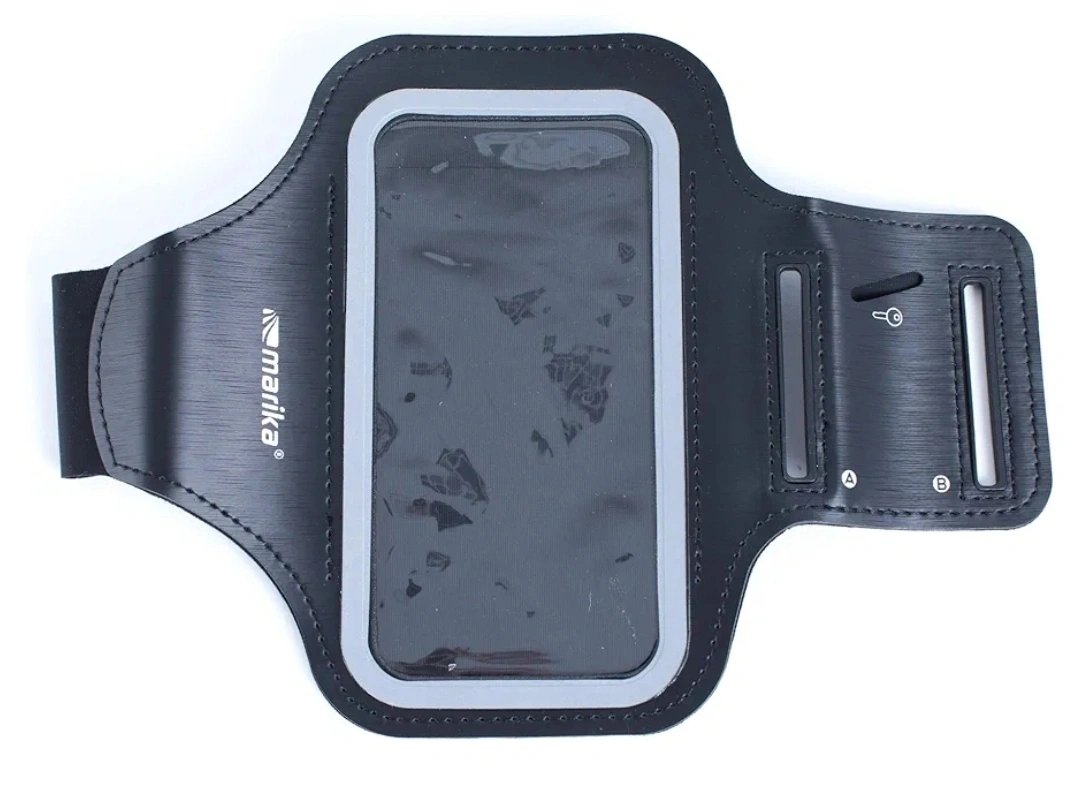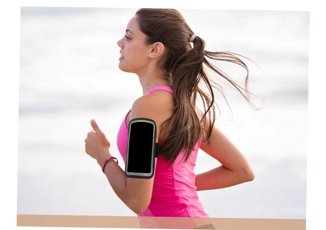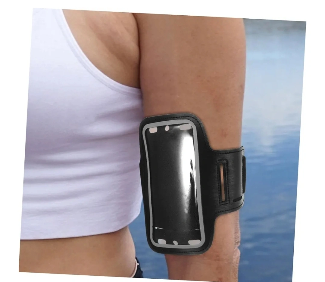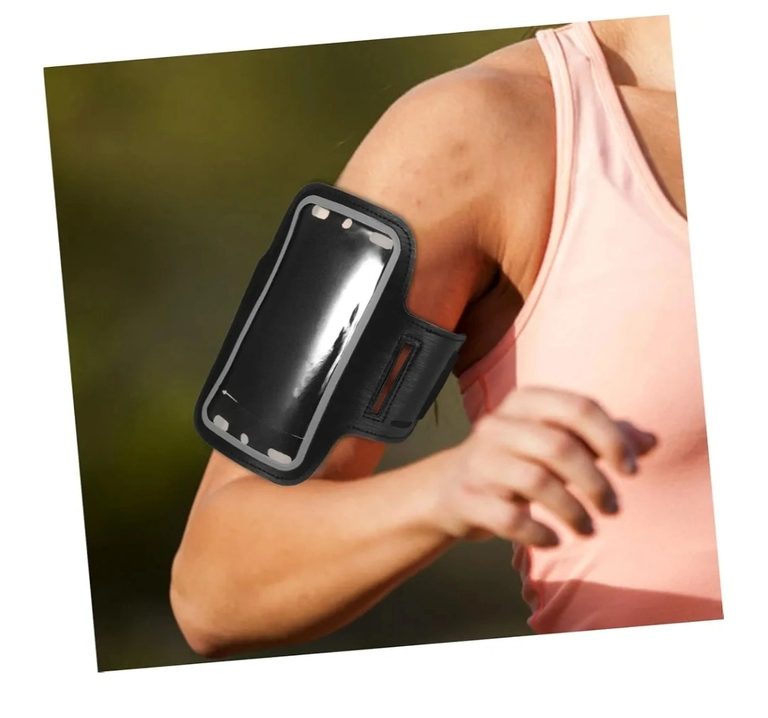 Armband for sports activities. Features a clear window to place your phone. The armband secures your phone to your arm while exercising, allowing you to easily track your progress without missing a beat.