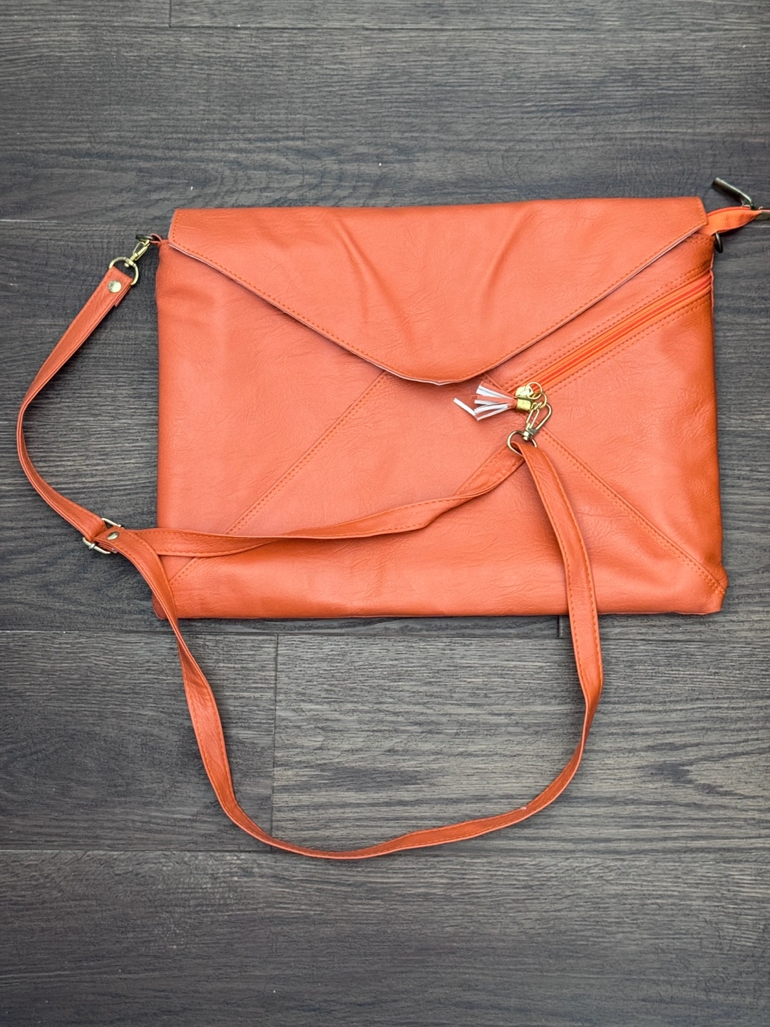 The shoulder bag is a beautiful orange colour. It features a long adjustable strap. It has an envelope style flap. There is a zipper on the front. Perfect for carrying your daily essentials to work or a nice outing. Pick up Yonge and Davisville