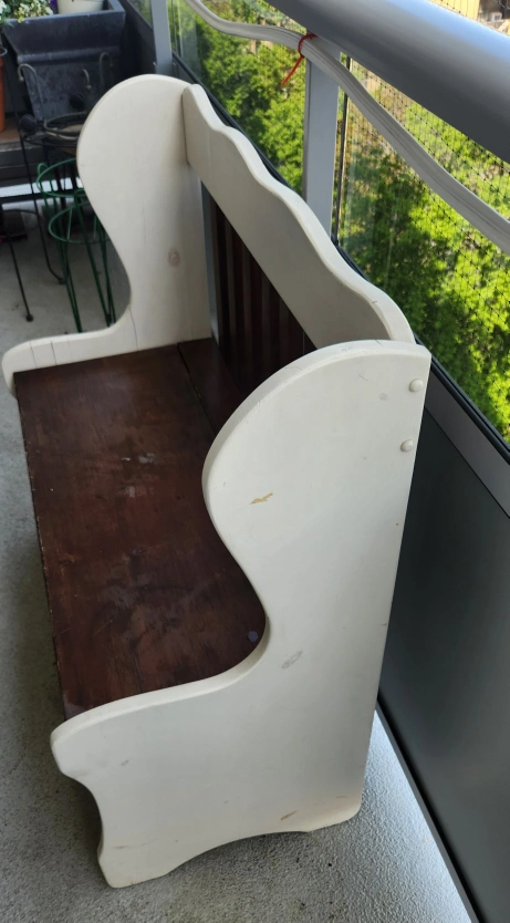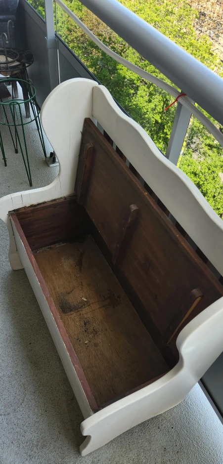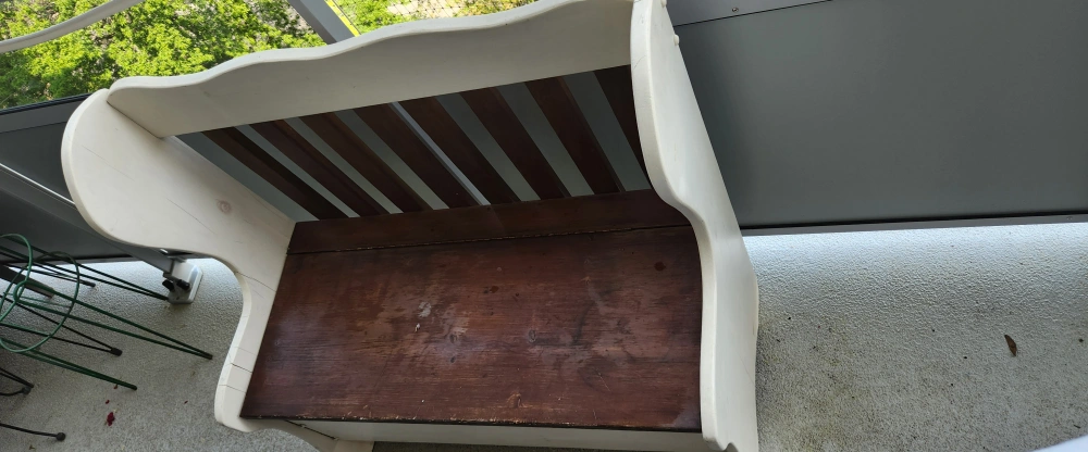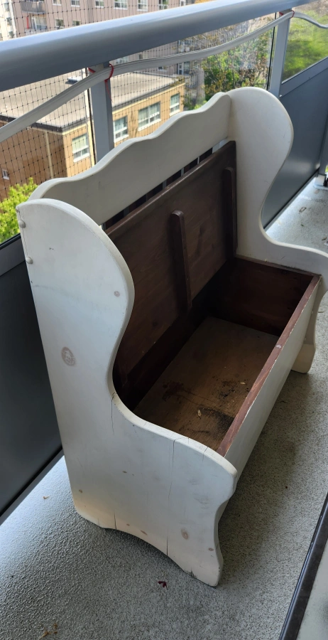 Wooden storage bench with a white painted frame. Features a backrest with wavy edges. Includes a storage compartment inside the seat. Use this bench to keep you feeling grounded at the end of a busy day. This is a great bench for a garden as plant stand and storage. Needs a fresh paint job otherwise it's in great shape. asking $45.00