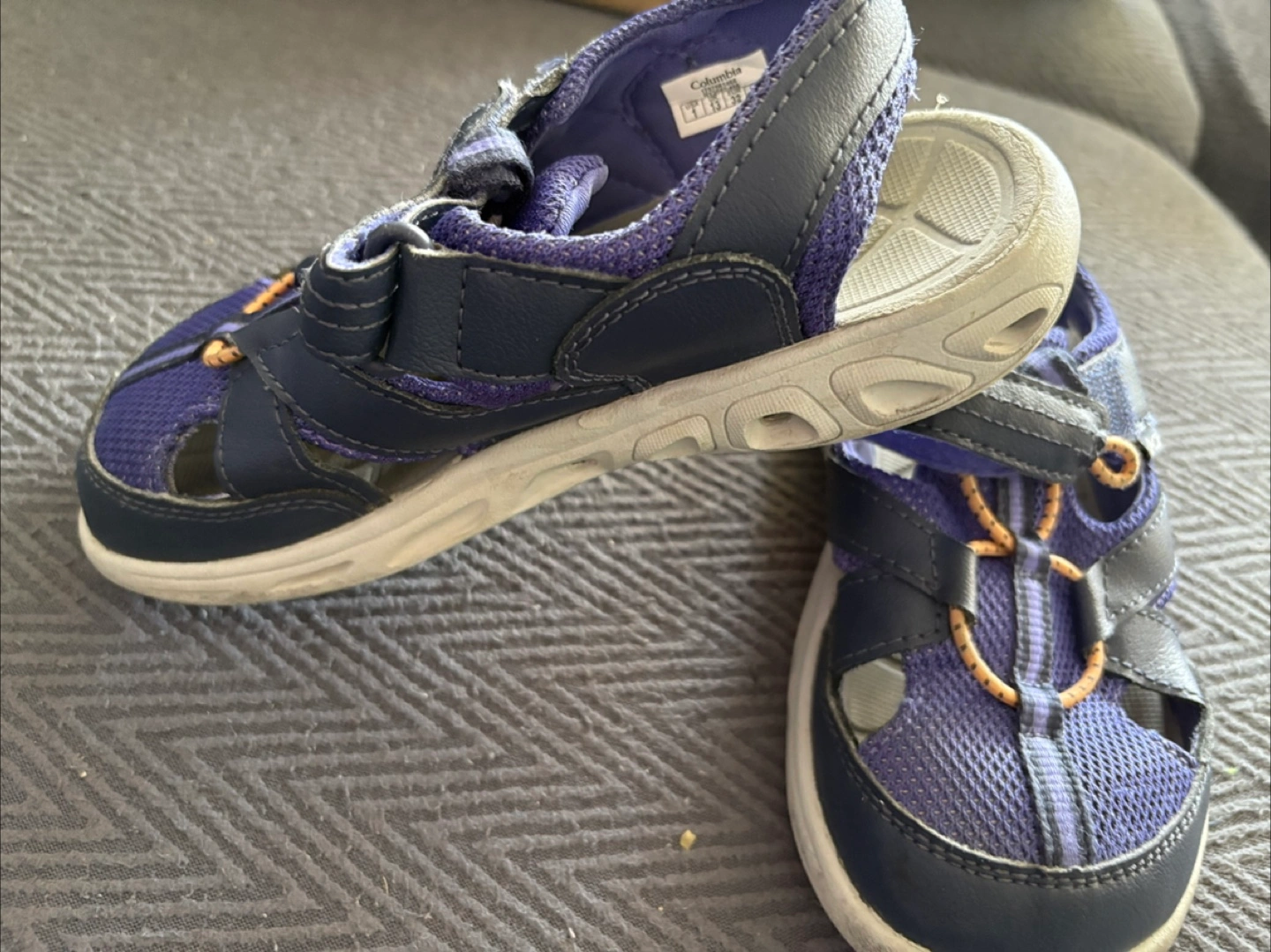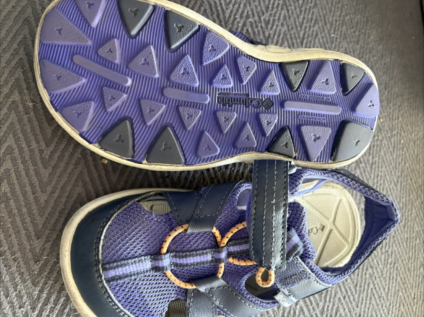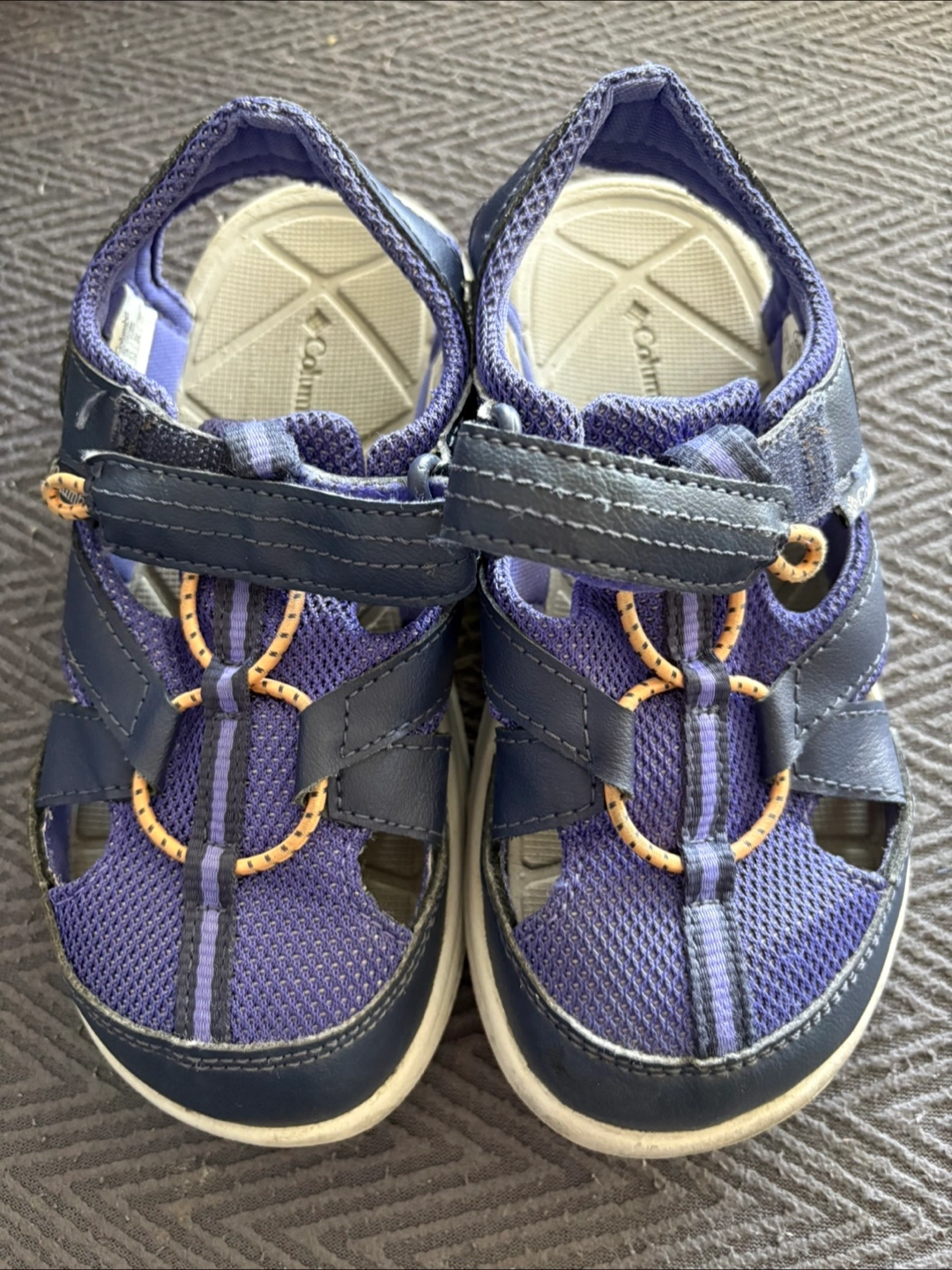 Blue and purple sandals. Features adjustable straps. Perfect for a leisurely stroll in the park.