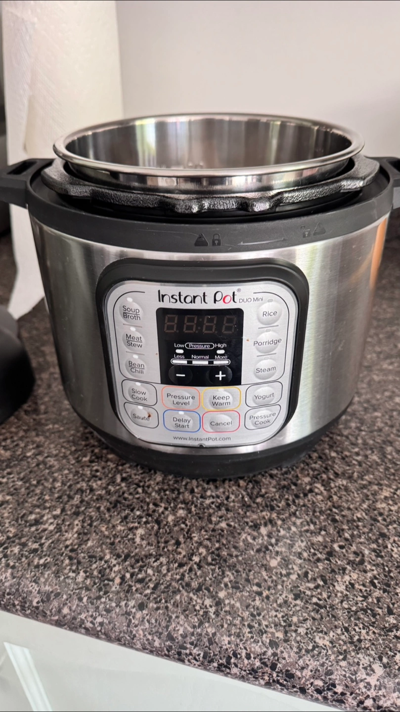 Electric pressure cooker. Features a stainless steel cooking pot. A handy kitchen appliance that can prepare a variety of delicious meals quickly, making dinner time a breeze.