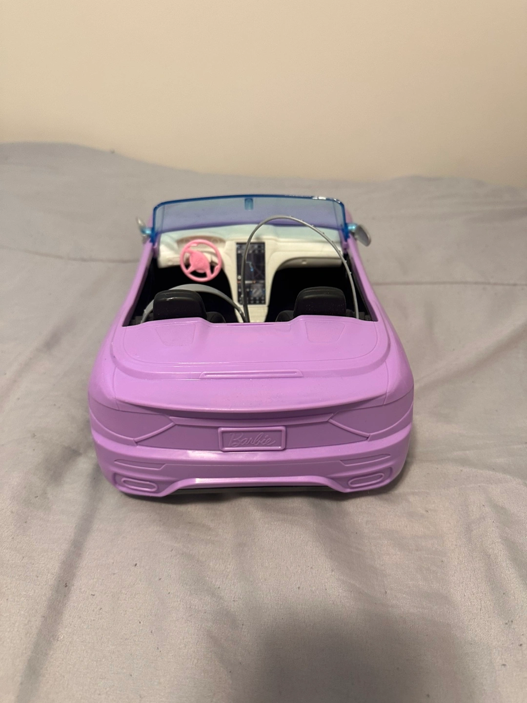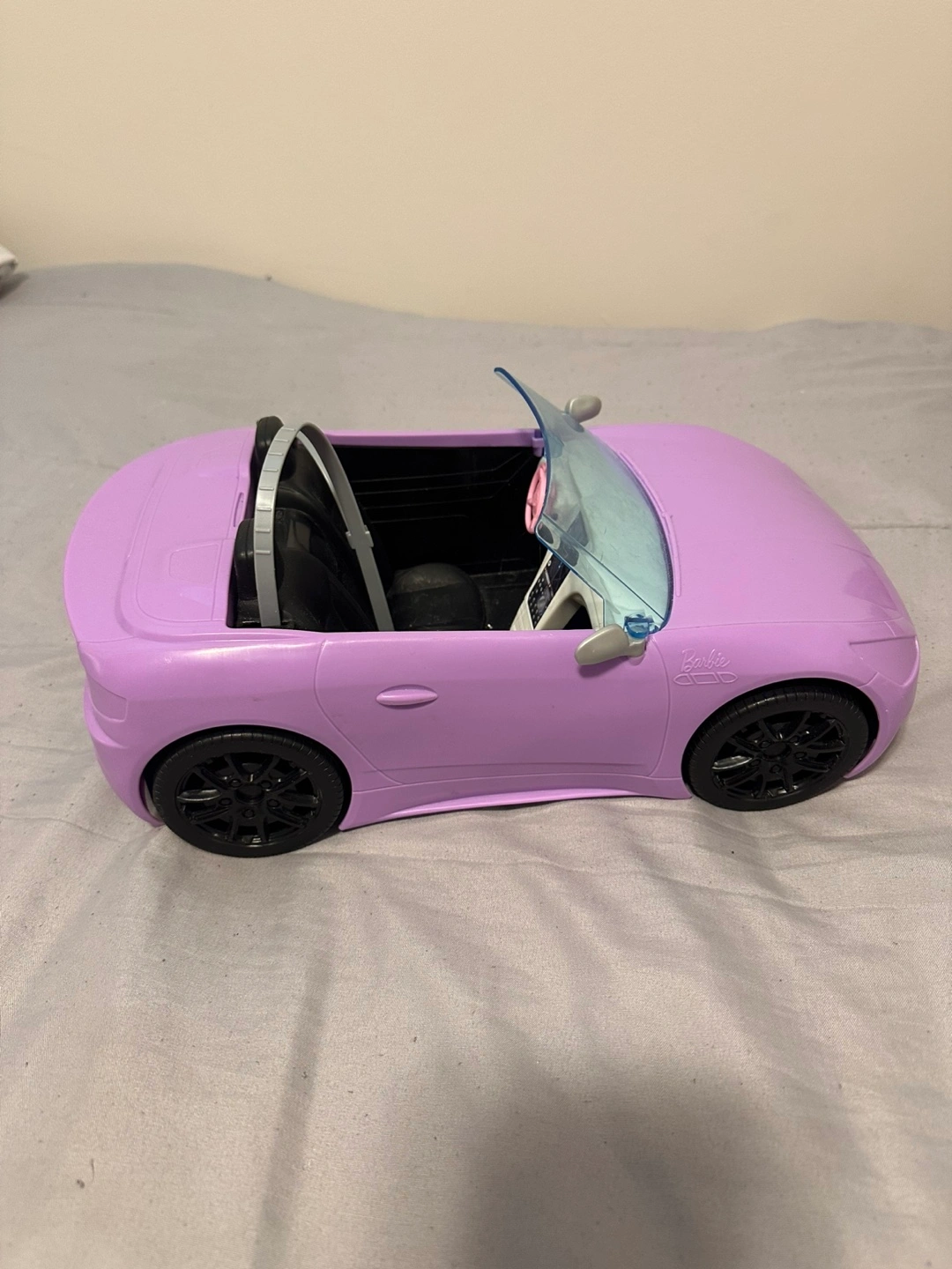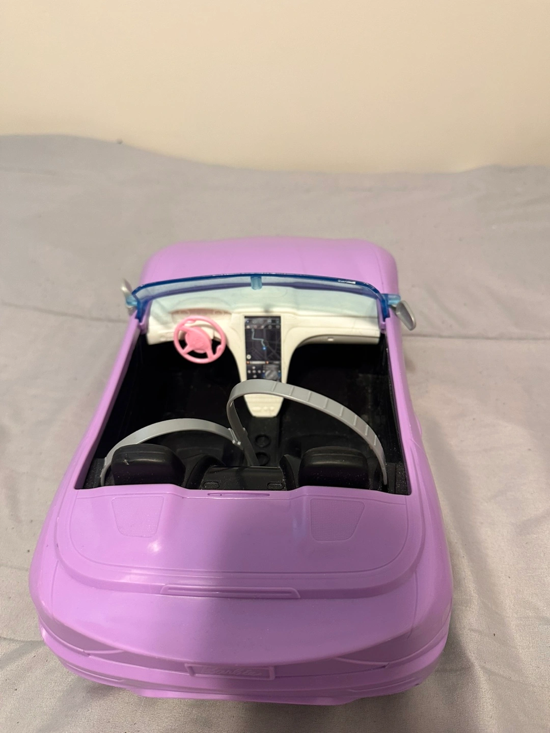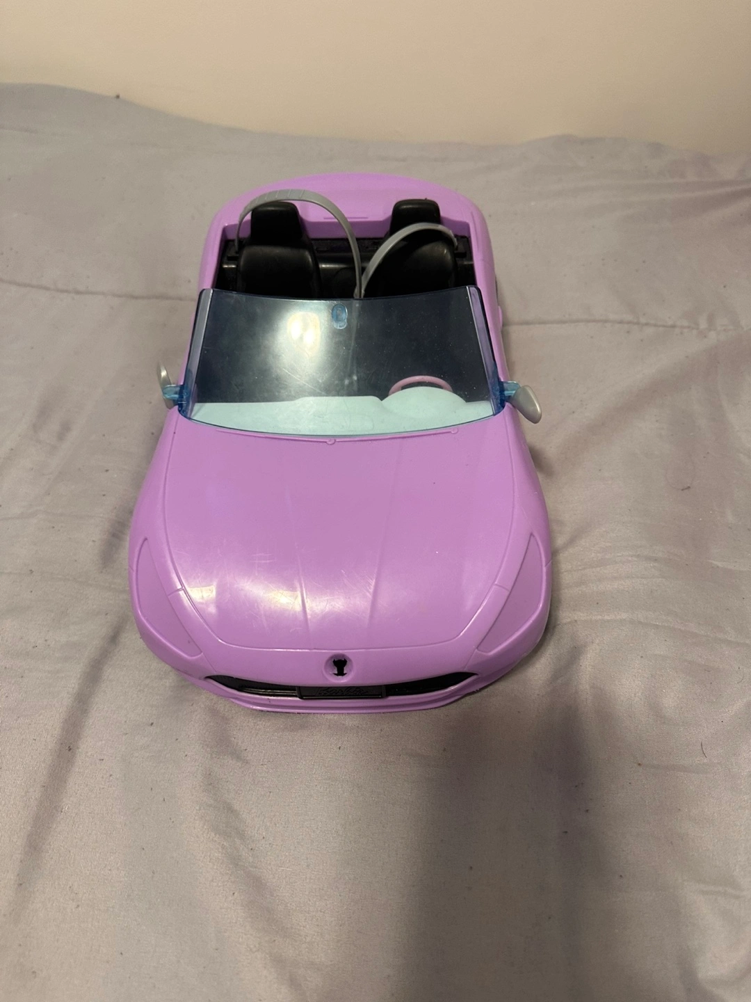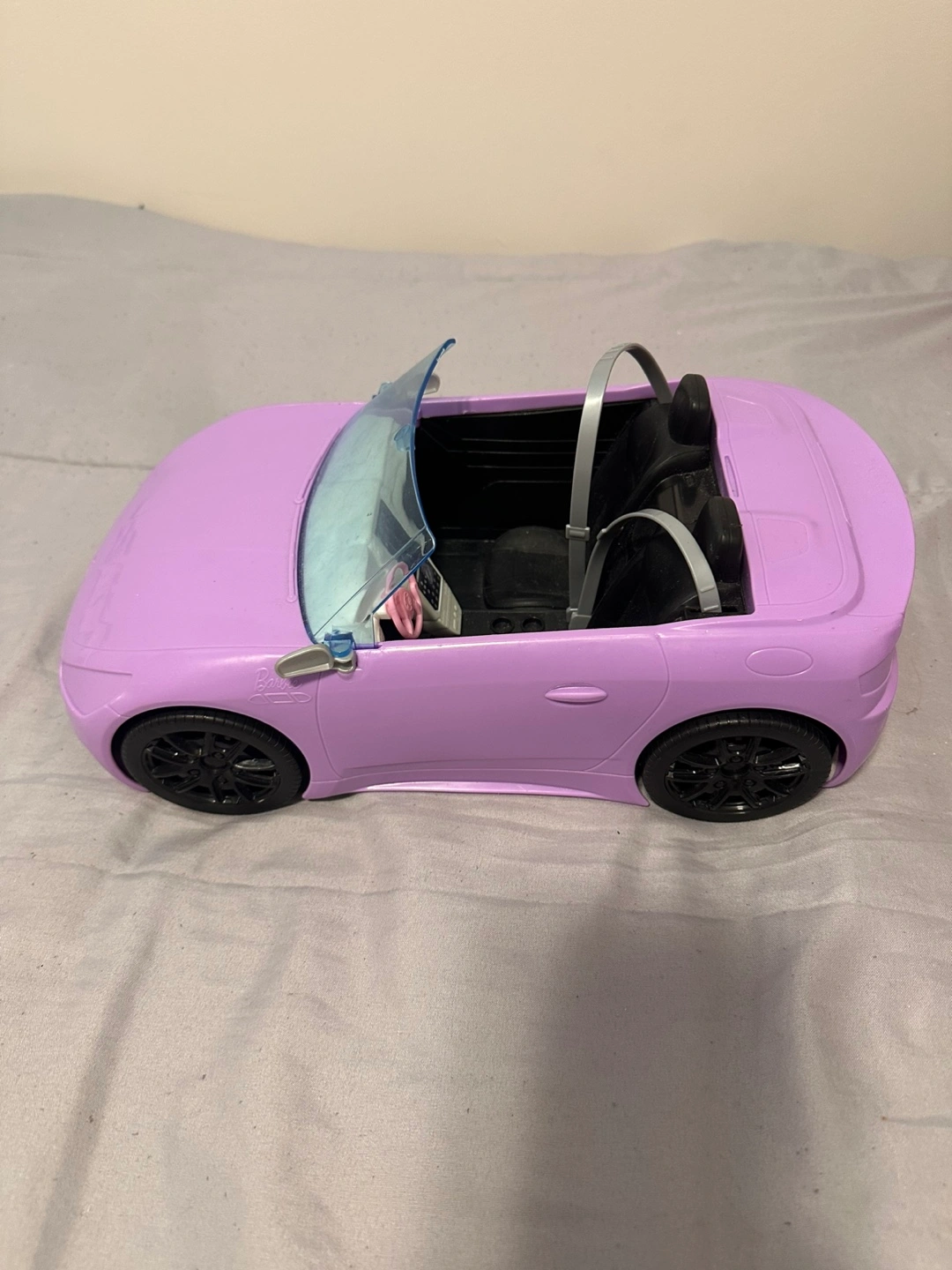 Purple toy car. Includes black tires and a steering wheel. Makes for an enjoyable and stress-free playtime experience.