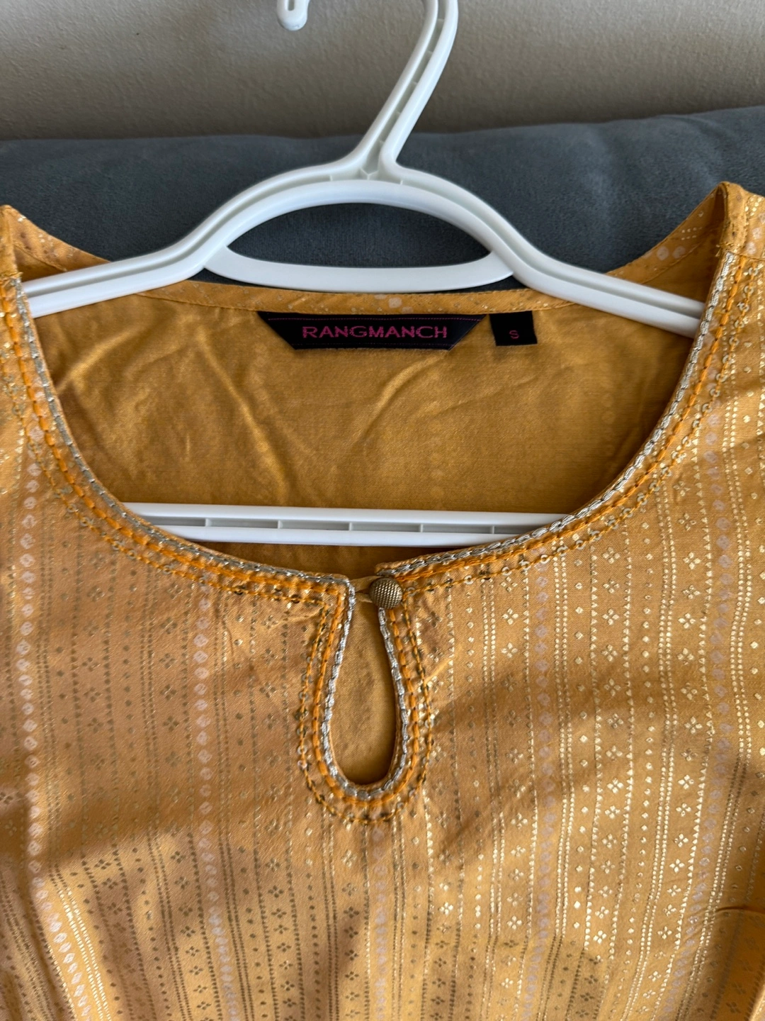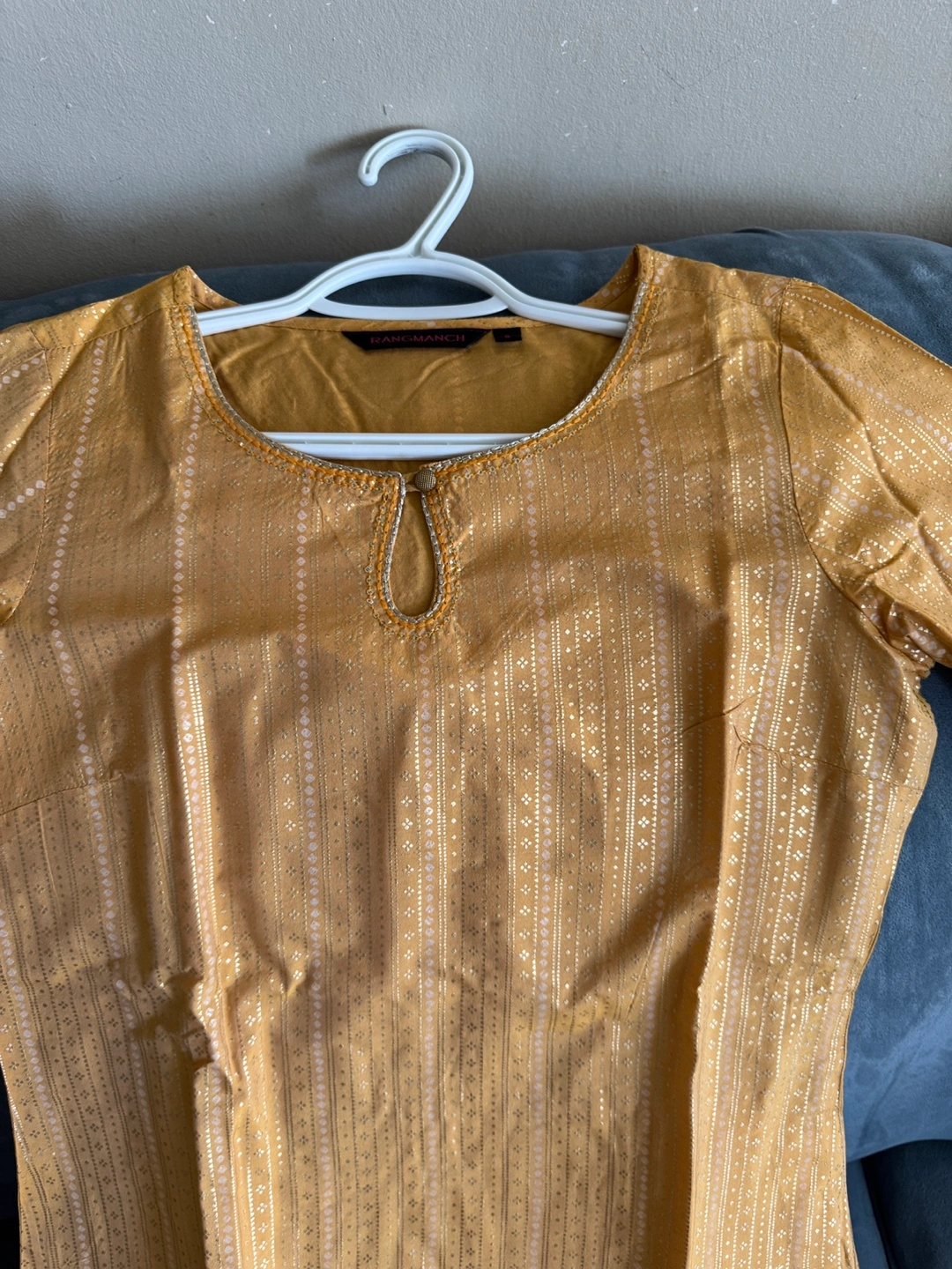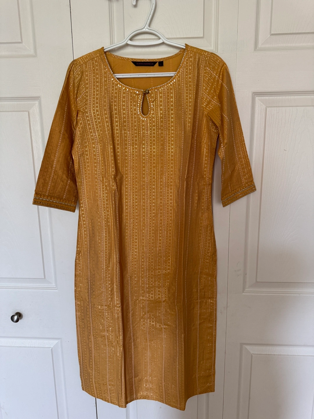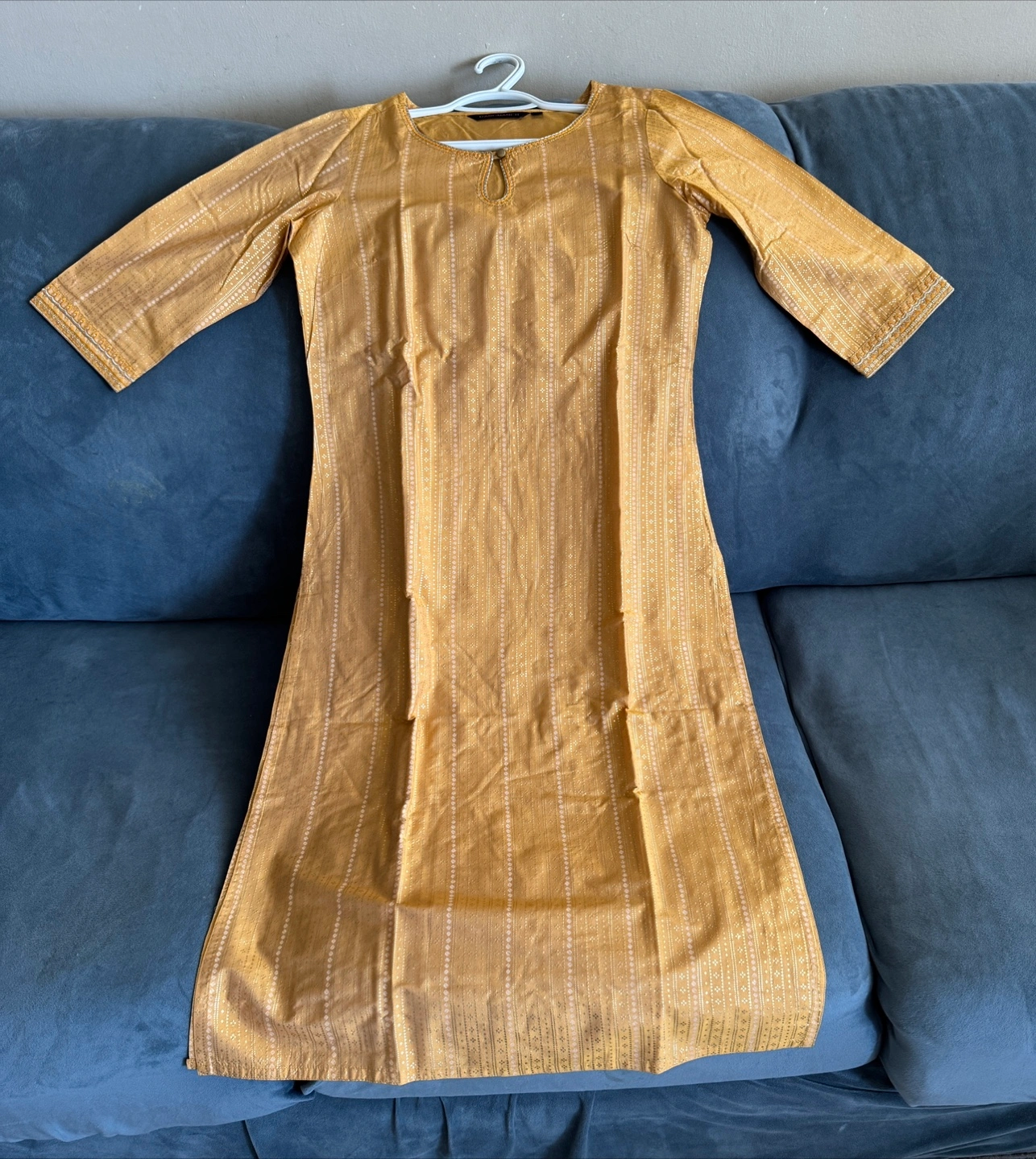 Mustard-coloured dress. Fabric appears to be textured. Comes with a keyhole detail. Perfect for a relaxing day out. Pickup near dixie and bloor