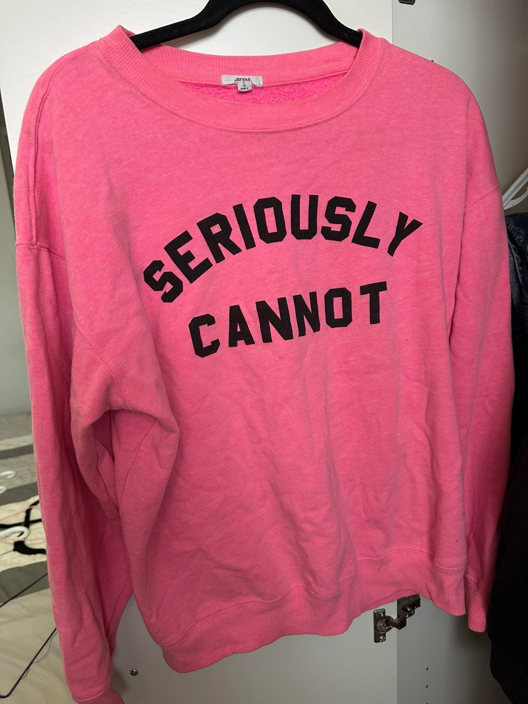 A pink crew neck sweatshirt. Features the words 'Seriously Cannot' across the chest in large, bold letters. It's a great item to wear while you're curled up with a good book. Size:L pay by cash please