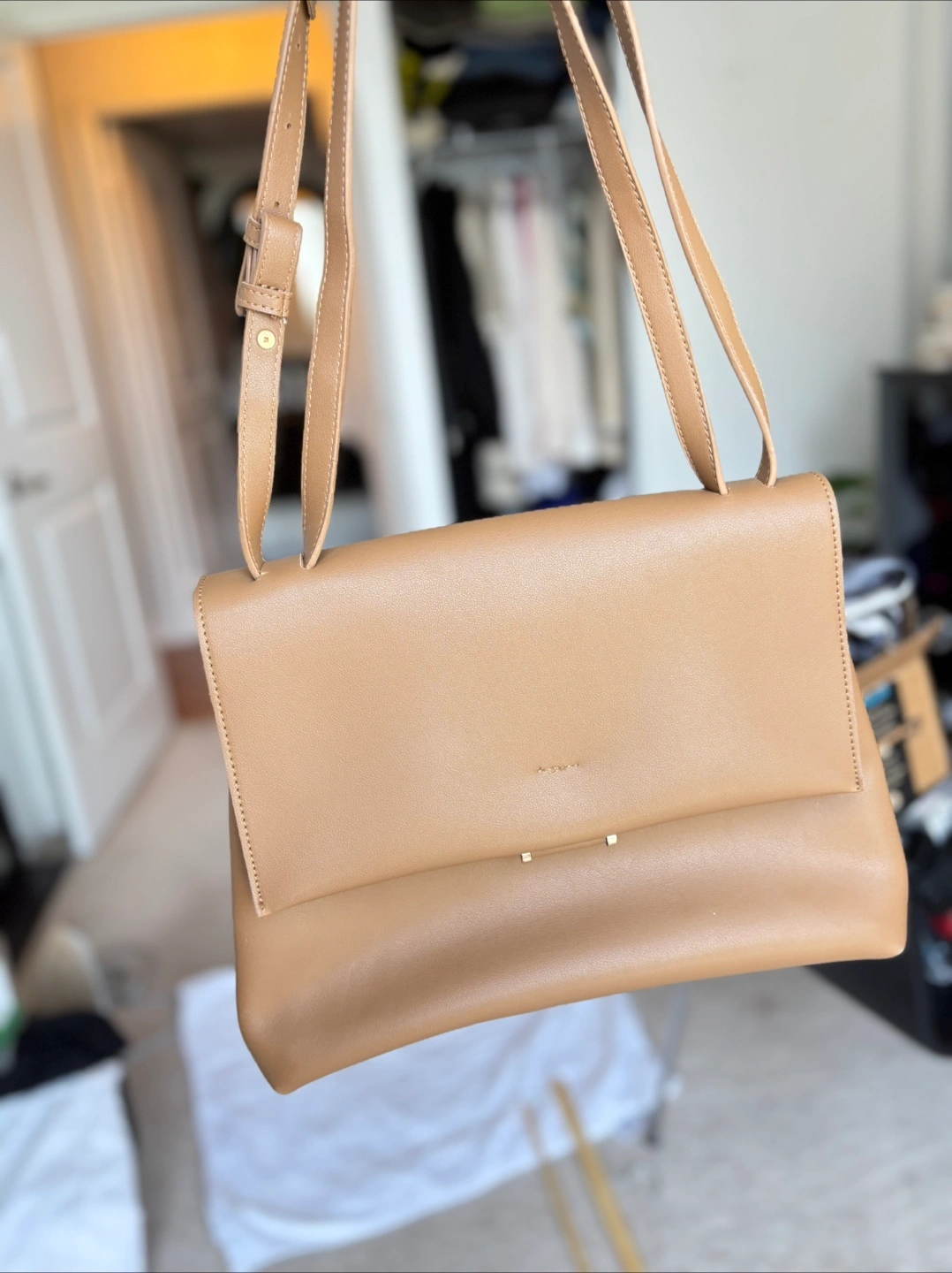 A beautiful tan crossbody bag. Features a main compartment, along with multiple interior compartments. Also includes an adjustable strap. A perfect bag to carry your essentials, and find a moment of zen.