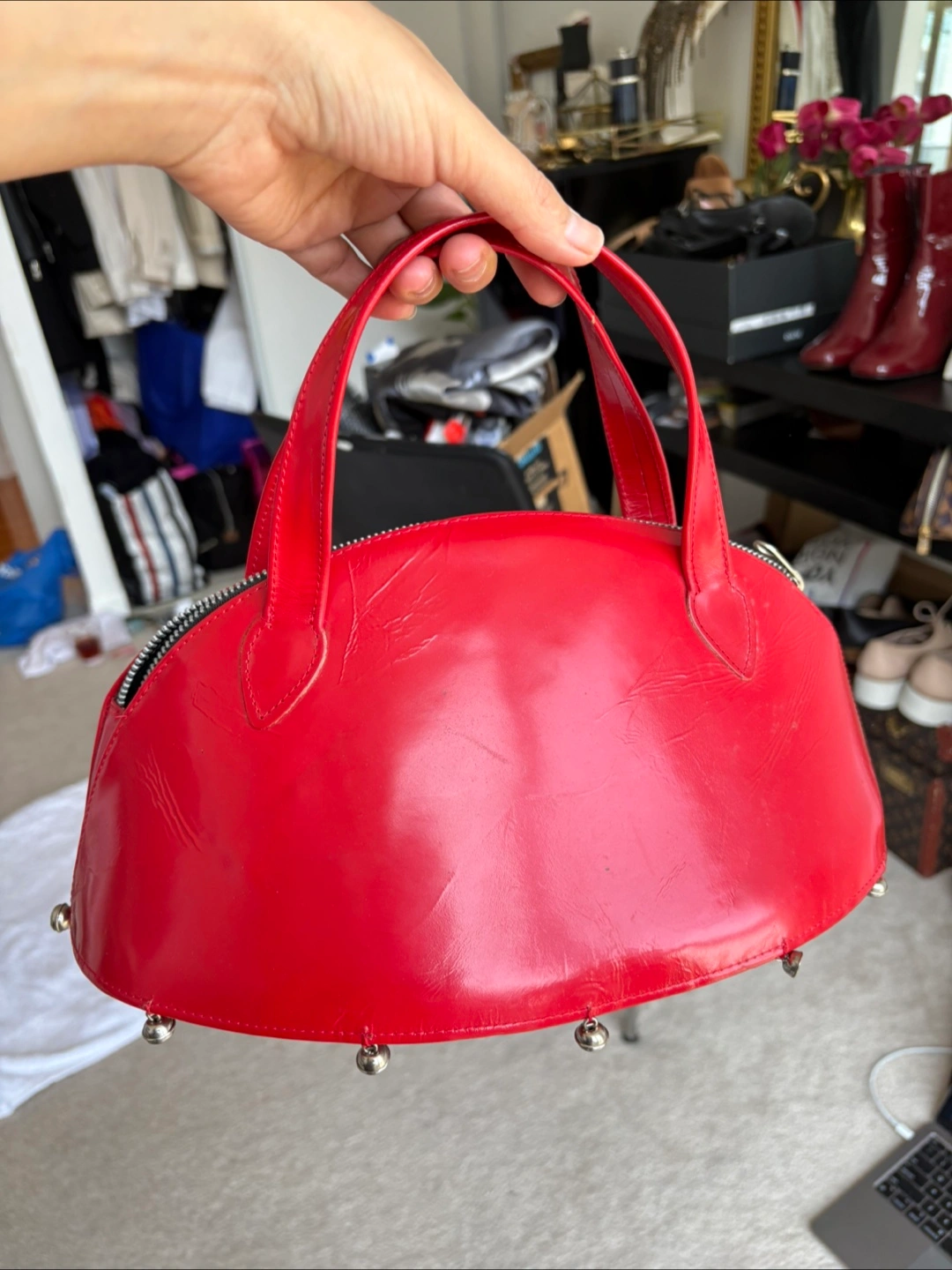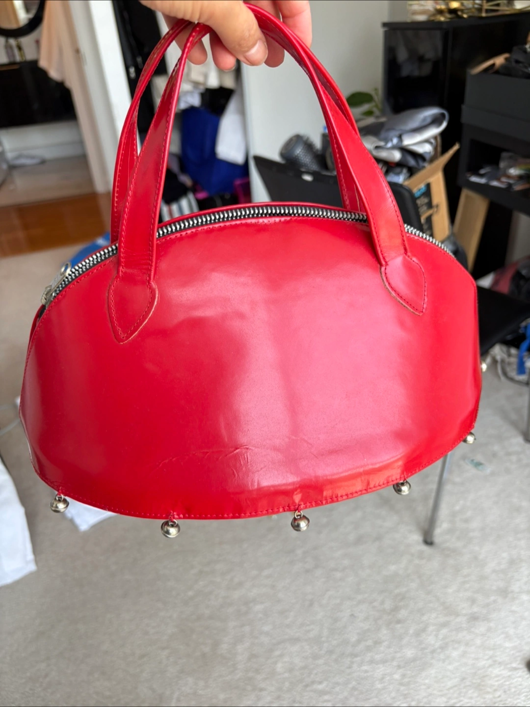 Eye-catching red handbag. Shiny finish with zipper closure. Features short handles and some metallic details around the base. Perfect for storing your essentials while you are out and about, taking a deep breath.