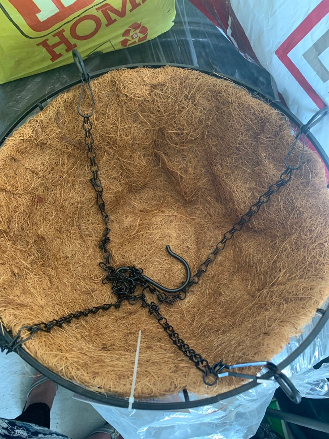 Round hanging basket. Includes a coconut liner. Metal frame. Comes with a hanging chain, allowing for easy display. This basket is a perfect way to bring a touch of nature to your outdoor space. Selling as two each costs $15. Retail price is $20 each. Pick up only.