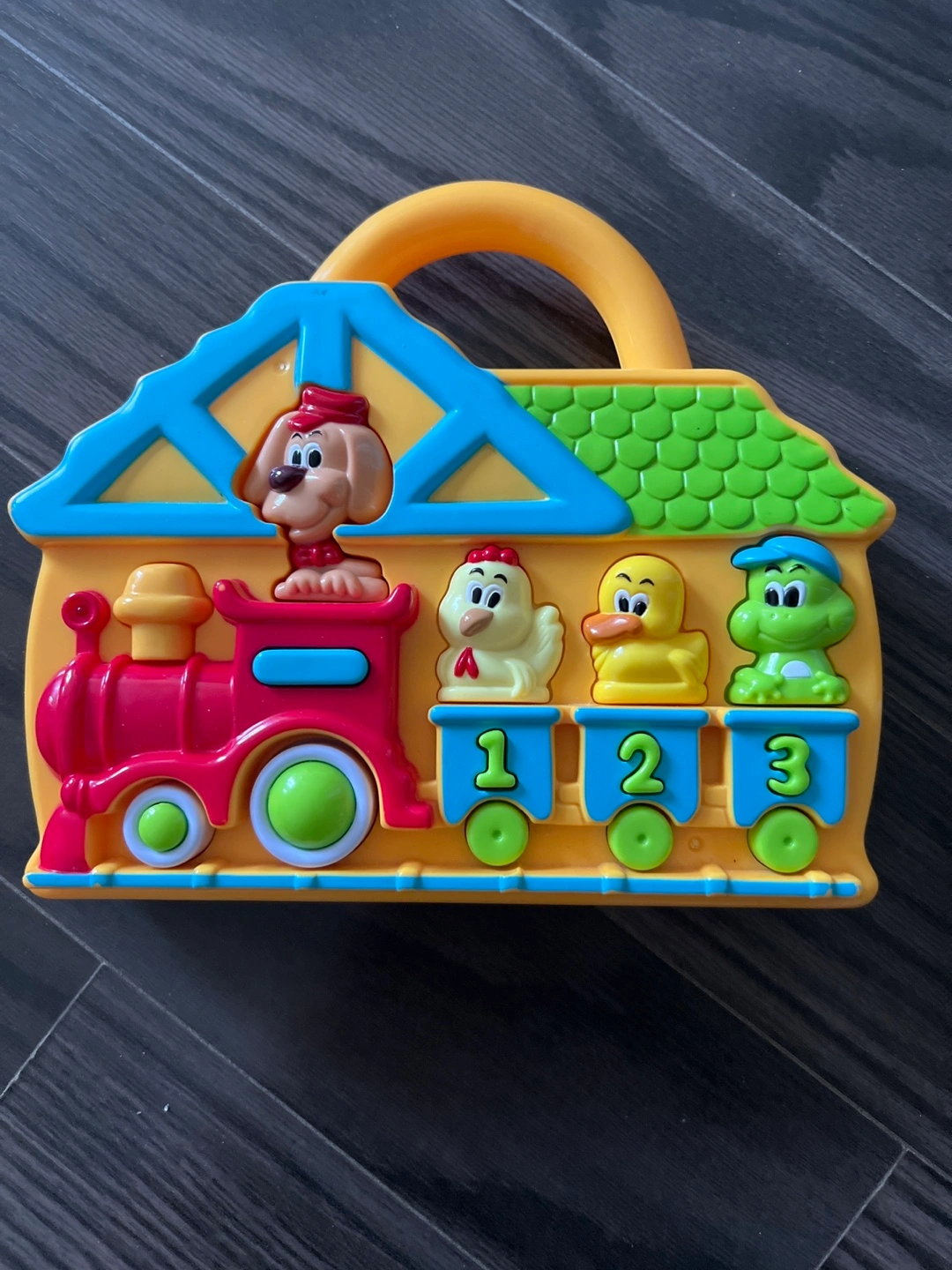 Brightly coloured toy train. Features different animal characters, with train cars numbered 1, 2 and 3. A great source of fun and entertainment.