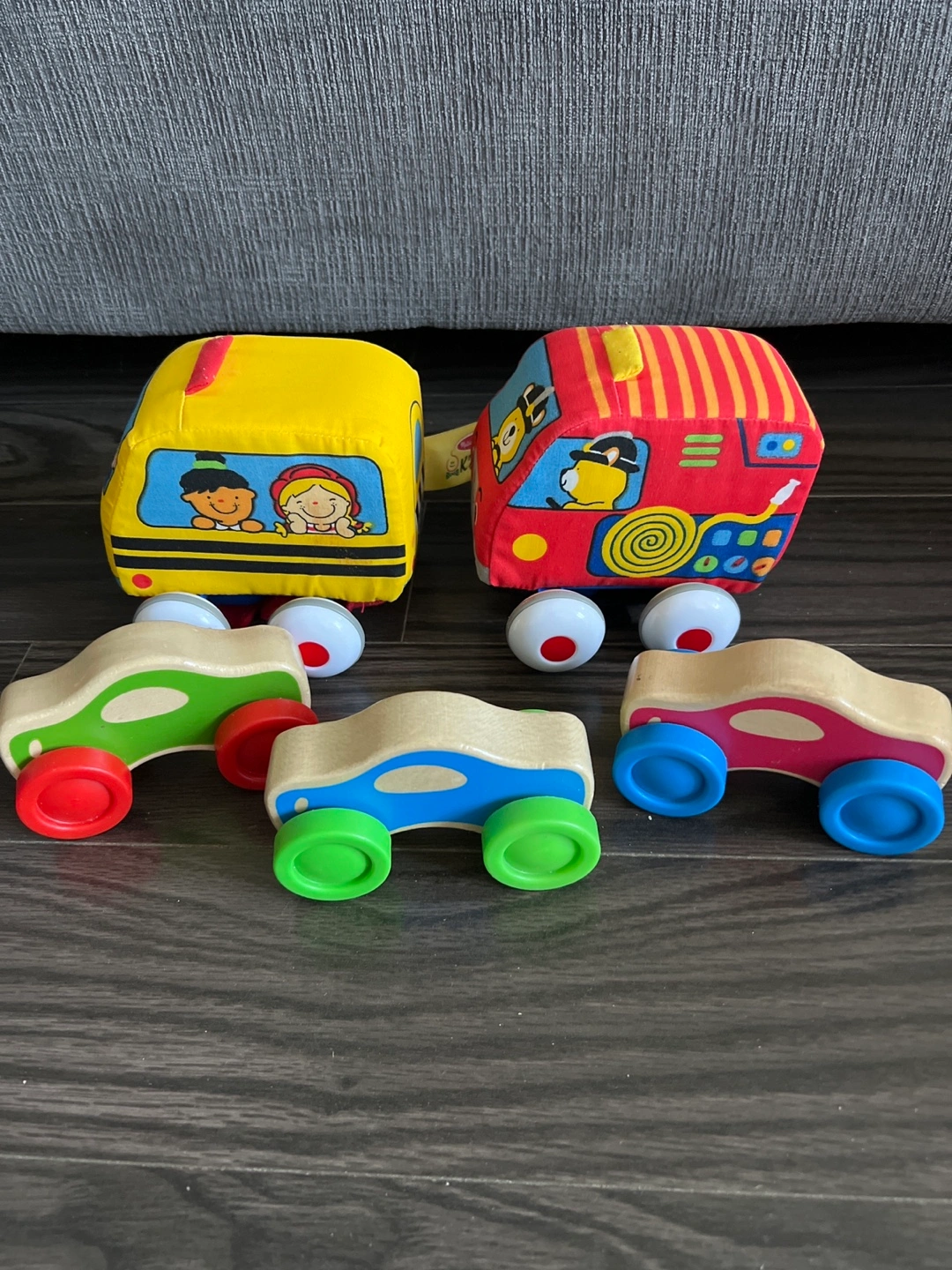 Included are two fabric pull-along vehicles, with wooden wheels and a few small wooden vehicles. These toys can create a soothing environment for children at play.