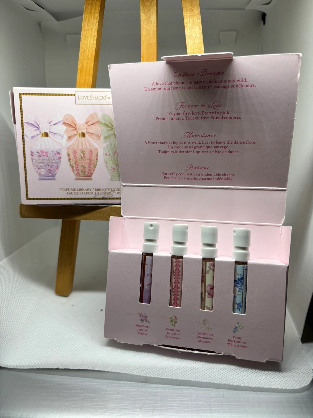 Lovely Loveshaffancy perfume set. Four sample-sized bottles are included. Would be a wonderful gift for a loved one. price per each