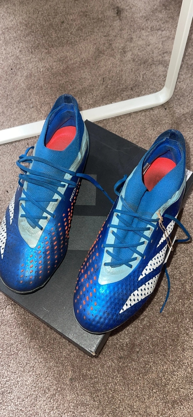 A pair of football cleats in shades of blue. Features laces and what appears to be an orange pattern. These cleats are great for a casual afternoon of playing soccer. Price is very negotiable