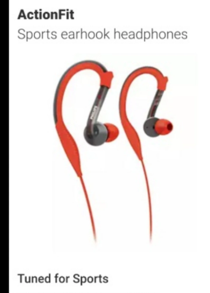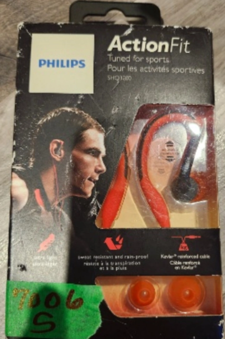 ActionFit earhook headphones. Tuned for sports. Sweat resistant and rain-proof. Kevlar reinforced cable. A perfect item to bring peace and quiet to your long walks. brand new never used in box excellent quality