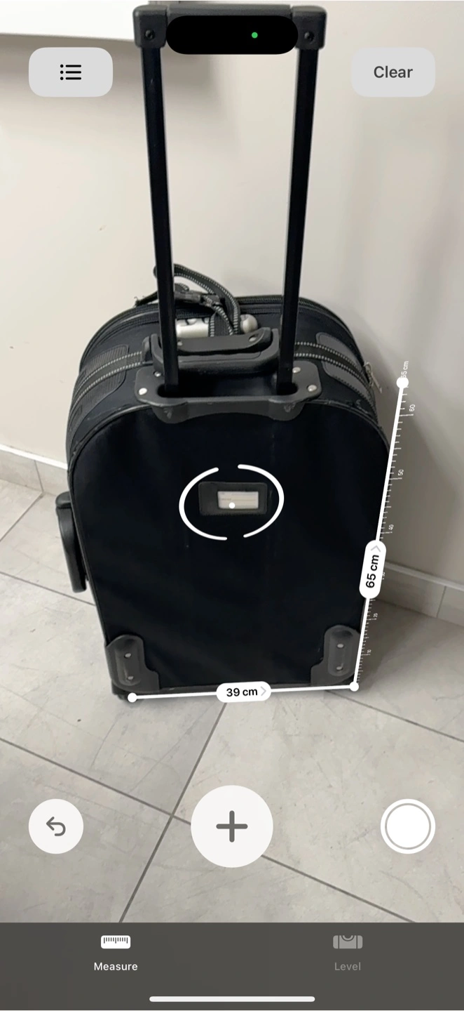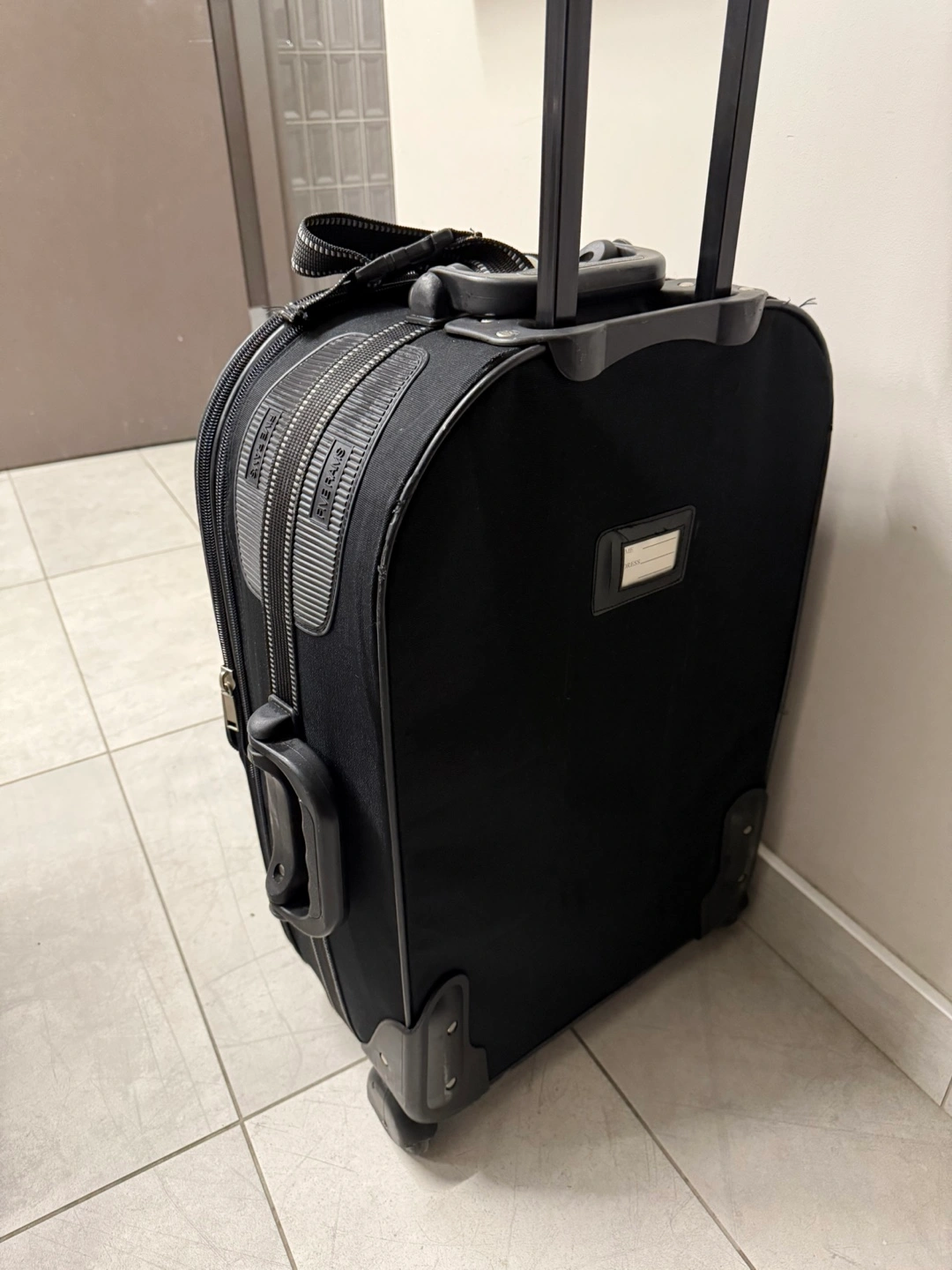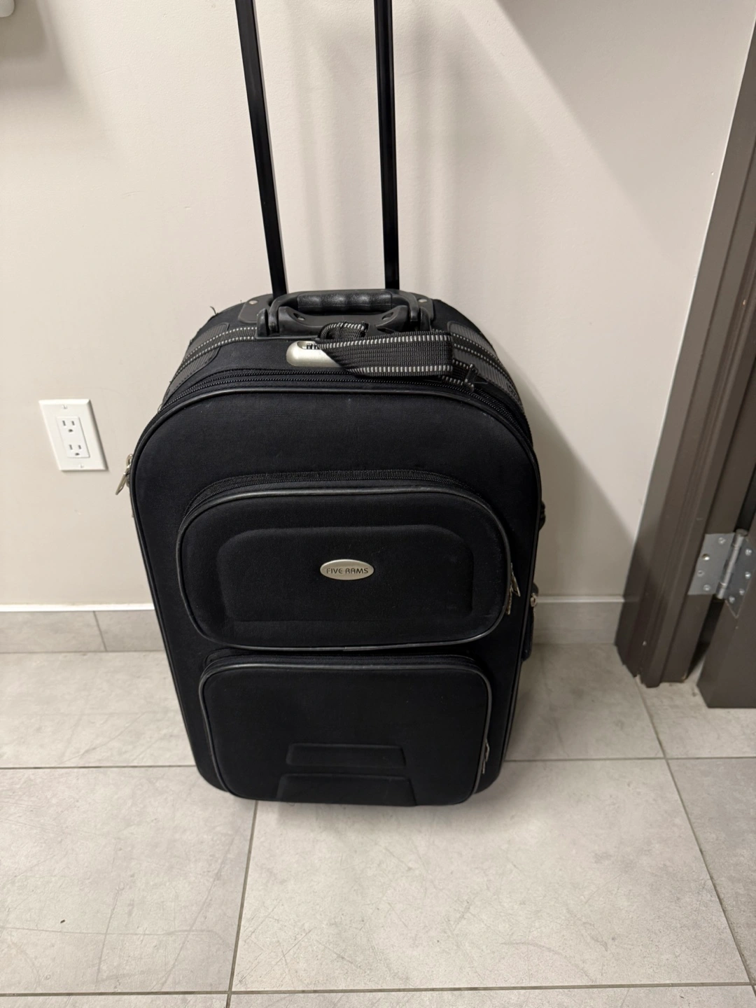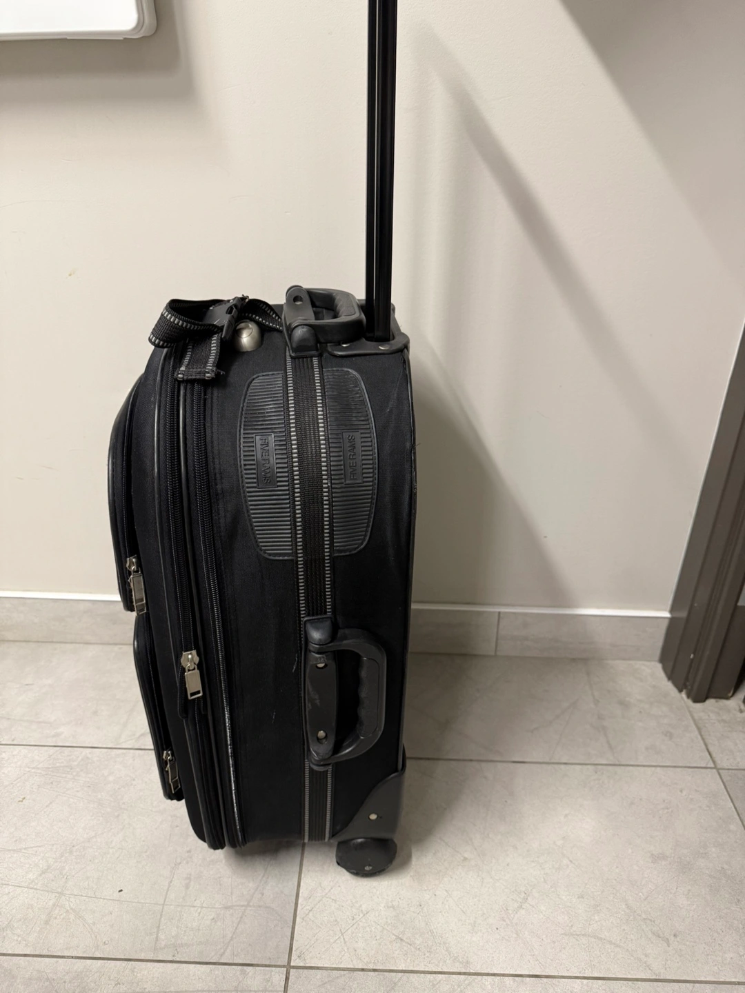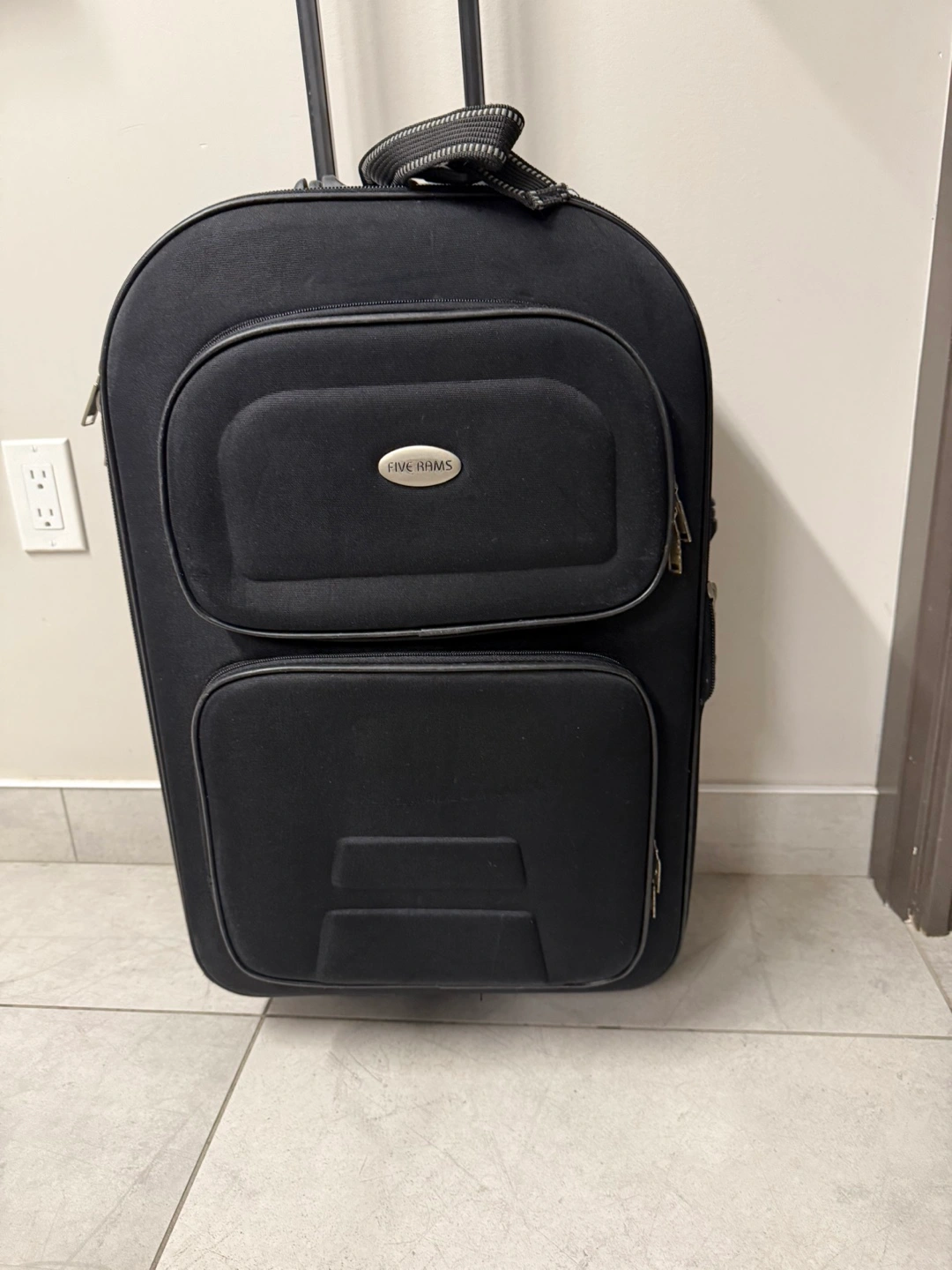 A black rolling suitcase. It has a retractable handle and two wheels. There are two exterior zippered pockets, as well as a large main compartment. This suitcase would be great for a weekend getaway.