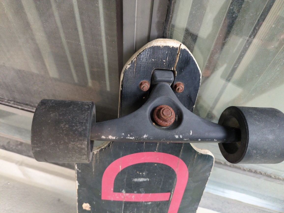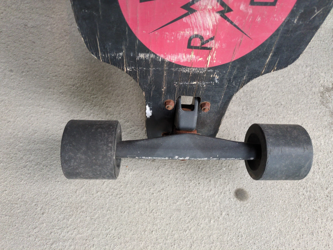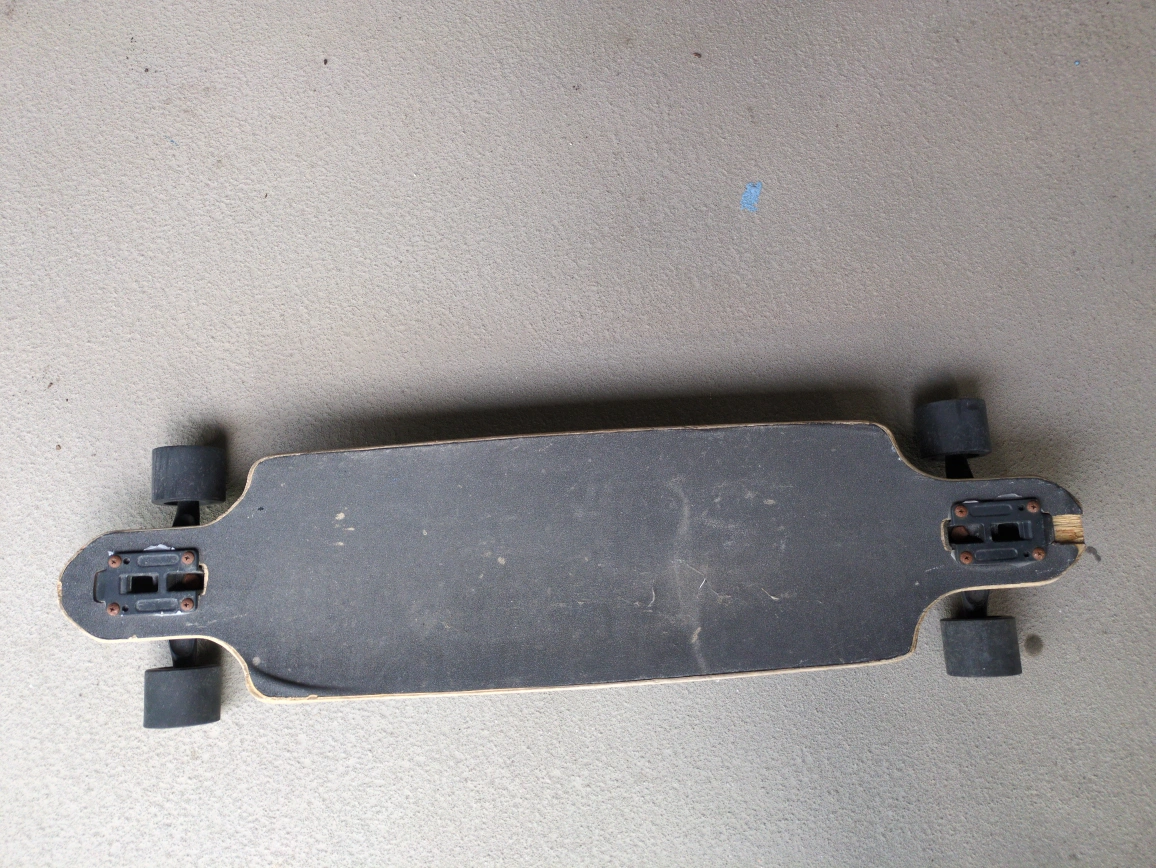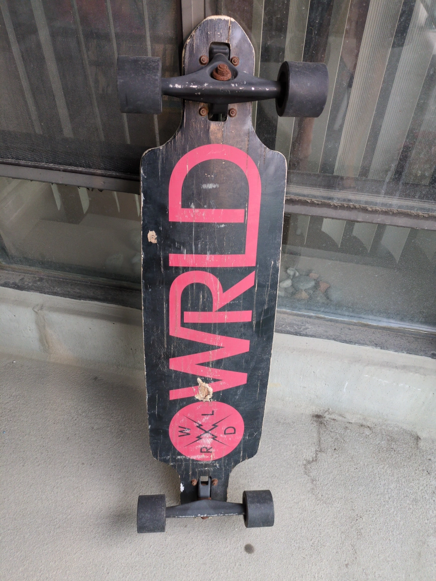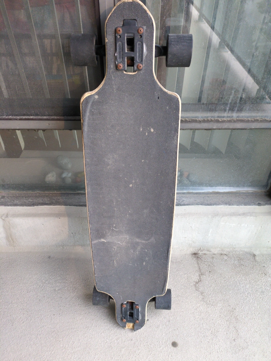 Longboard, with black wheels and trucks. The deck has some wear and tear. The grip tape shows some marks.