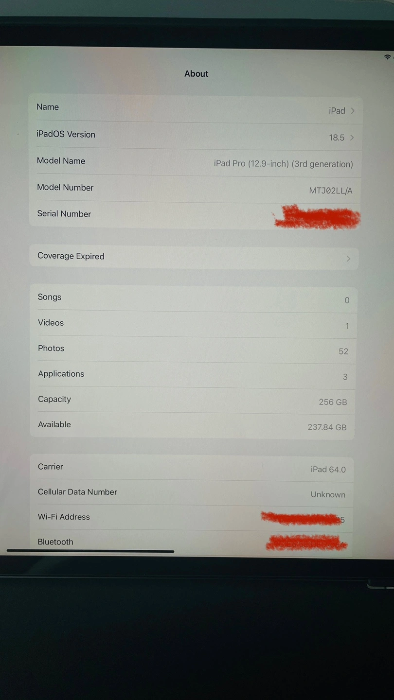 I am selling an iPad Pro, third generation. It's with a case. 🔹 Design & Display • Display: • 12.9-inch Liquid Retina display • Resolution: 2732 x 2048 pixels at 264 ppi • ProMotion (120Hz refresh rate) • True Tone and P3 wide color gamut • Design: • All-screen design (no Home button) • Flat edges and rounded corners • Thin bezels • Aluminum body • Available in Silver and Space Gray ⸻ 🔹 Processor • Chip: A12X Bionic with 64-bit architecture • Octa-core CPU (4 performance + 4 efficiency cores) • 7-core GPU • Neural Engine for machine learning tasks ⸻ 🔹 Camera • Rear Camera: • 12 MP • ƒ/1.8 aperture • 4K video recording at 24/30/60 fps • Front Camera: • 7 MP TrueDepth camera • Portrait mode, Portrait Lighting, Animoji and Memoji • Face ID support ⸻ 🔹 Biometrics • Face ID (no Touch ID)