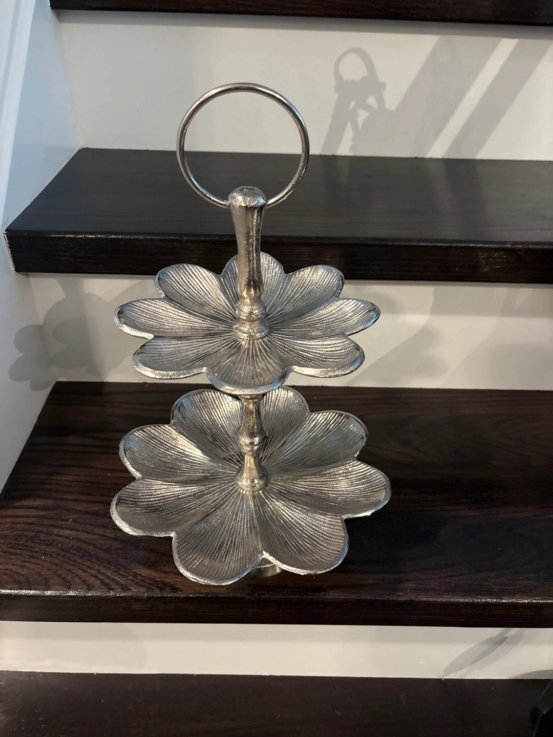 A beautiful, decorative serving piece. Features two tiers shaped like flowers. It has a handle at the top, allowing for easy transport. It's the perfect item to display baked goods.