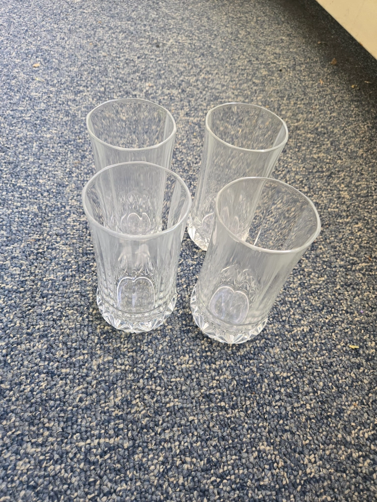 You will receive a set of four drinking glasses. Clear crystal material. Decorative, detailed bases. Perfect for your favourite beverage, any time of day.