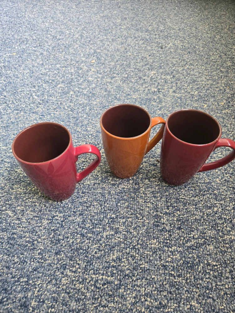 Three vibrant coffee mugs. Different colours: red, orange, and pink. The inside is a darker shade. These mugs can be used for your favourite drinks, whether it be tea or coffee, allowing you to take a moment and relax with a warm drink.