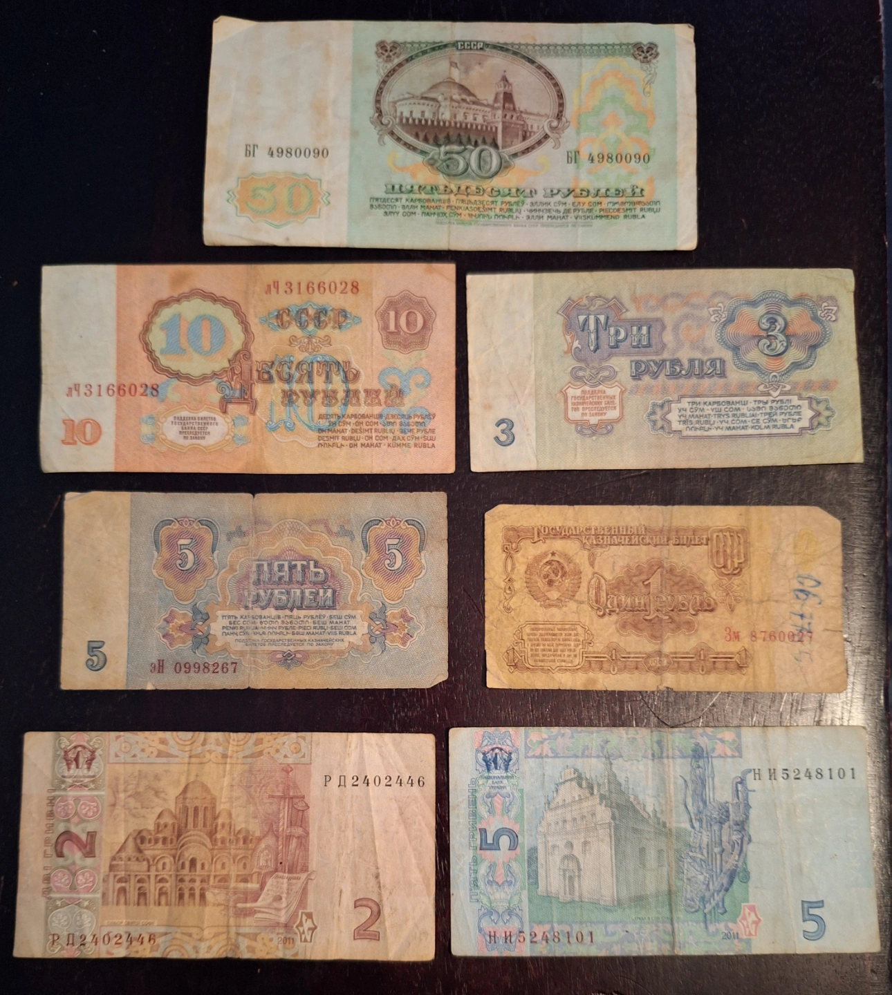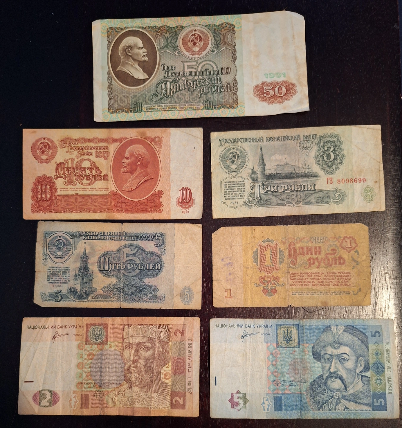 A collection of various vintage banknotes. Original USSR soviet money from 1960s 1, 3, 5, 10, 50 rubles. 2 and 5 hryvnia Ukrainian money from 2000s.