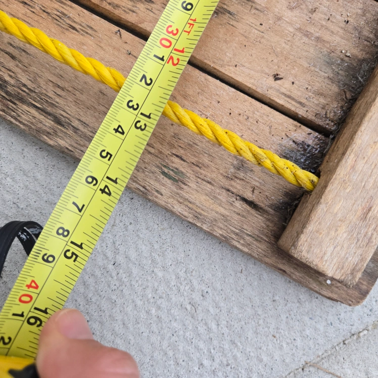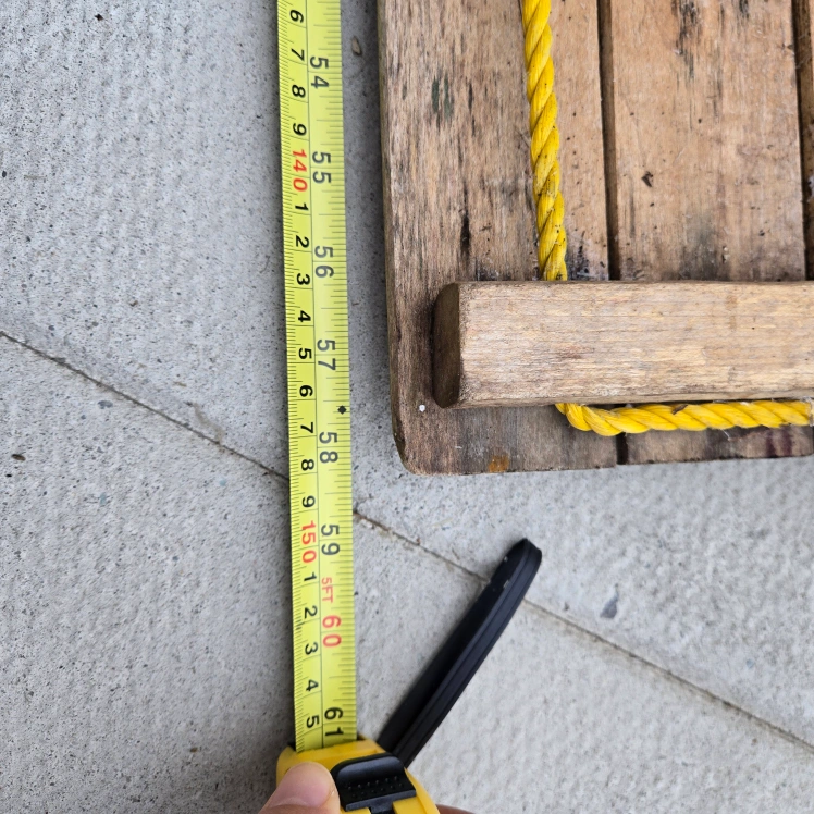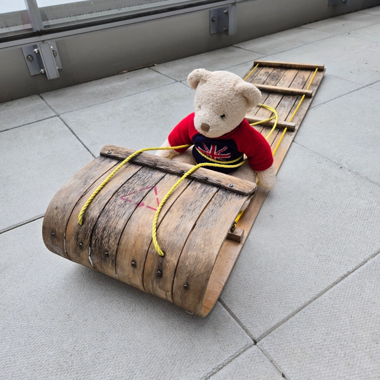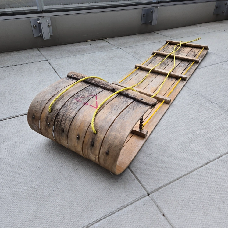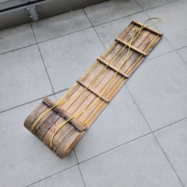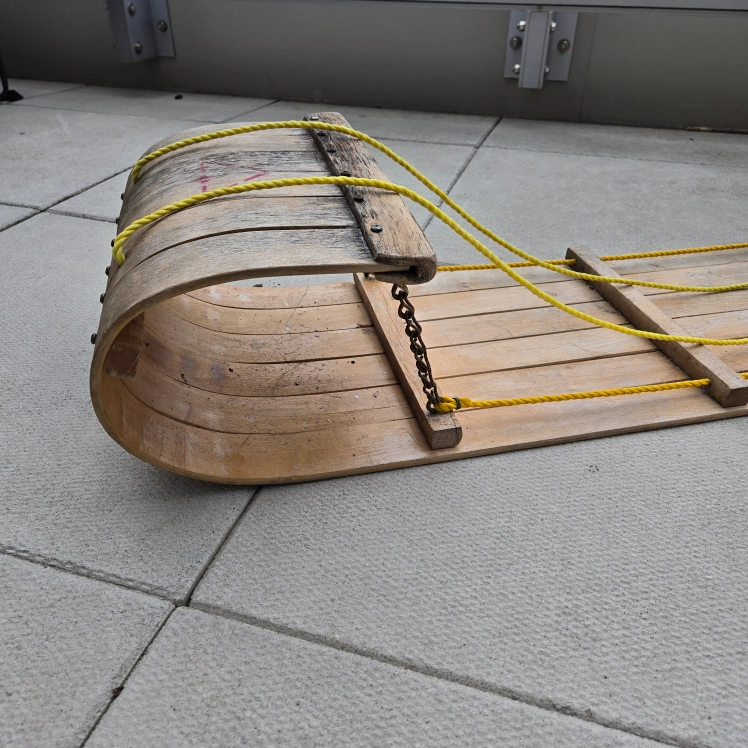 A classic wooden sled with curved front. Attached are several yellow ropes. You can imagine spending a relaxing afternoon gliding across the snow with this.