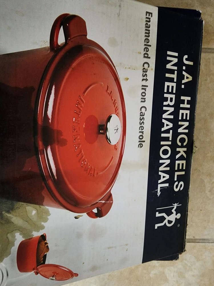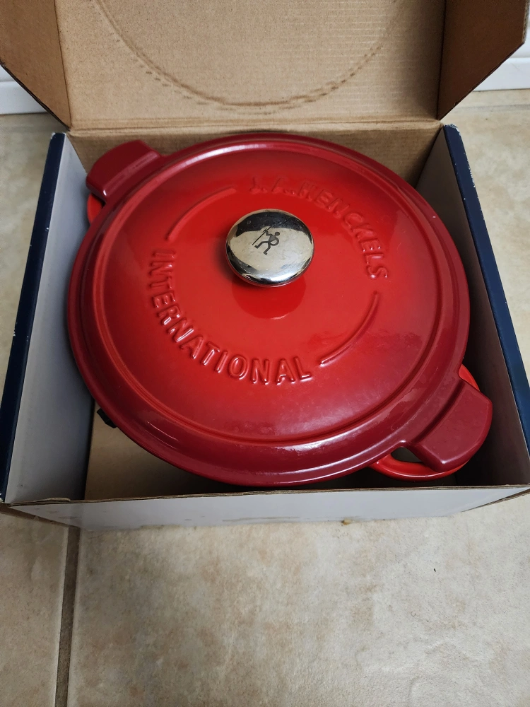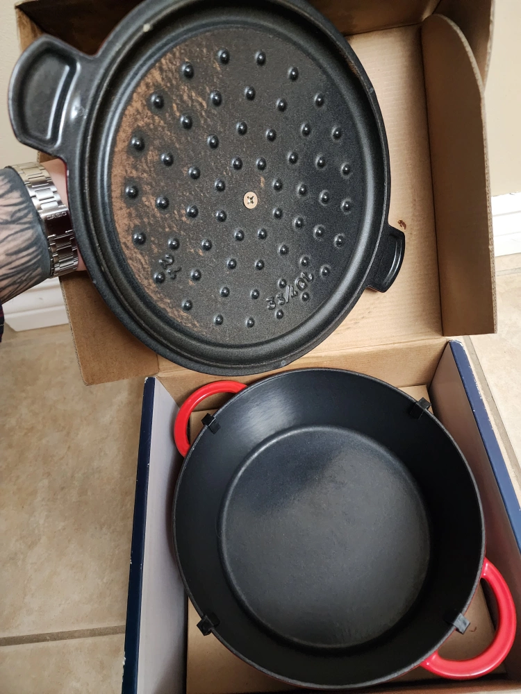 A lovely red casserole dish. 3.6L/3.75Qt It has a black interior with small holes. The lid features the brand's logo. Enjoy a nice, warm, home cooked meal that will help you feel relaxed after a long day.