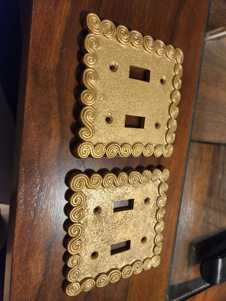 Here are a pair of gorgeous gold double switch plates. They are gold-coloured with an ornate scrolled design around the edges. The plates have holes for screws and cutouts for two switches each. These switch plates would bring a sense of peace and beauty to any room.