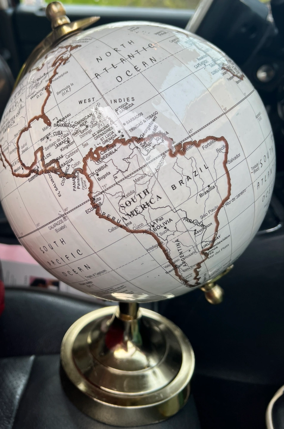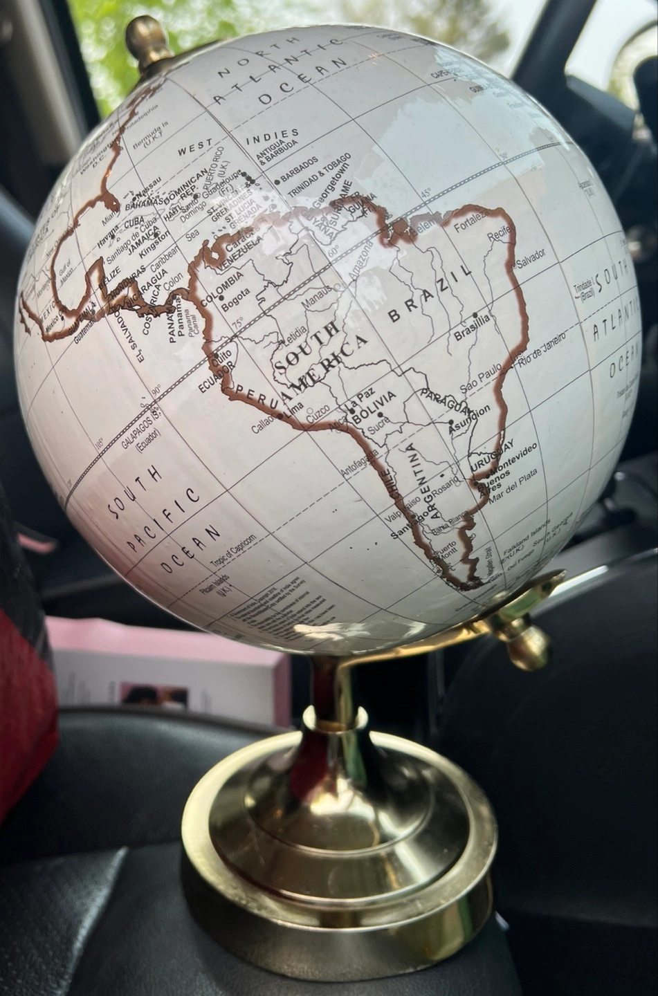 A decorative globe, with a gold stand. Great for travel inspiration or a calming meditative space. The globe shows the continents and oceans.