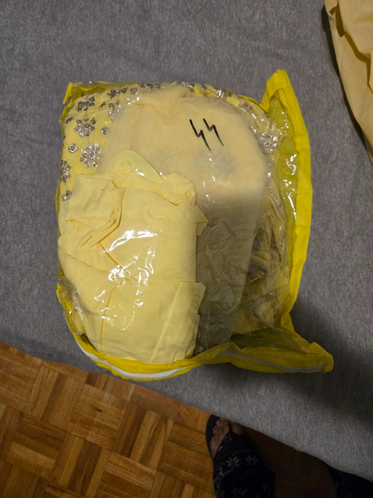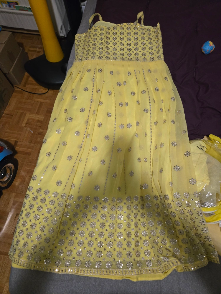 Lovely yellow dress. Features floral embroidery. Comes with a matching dupatta. A beautiful item to brighten up your wardrobe.