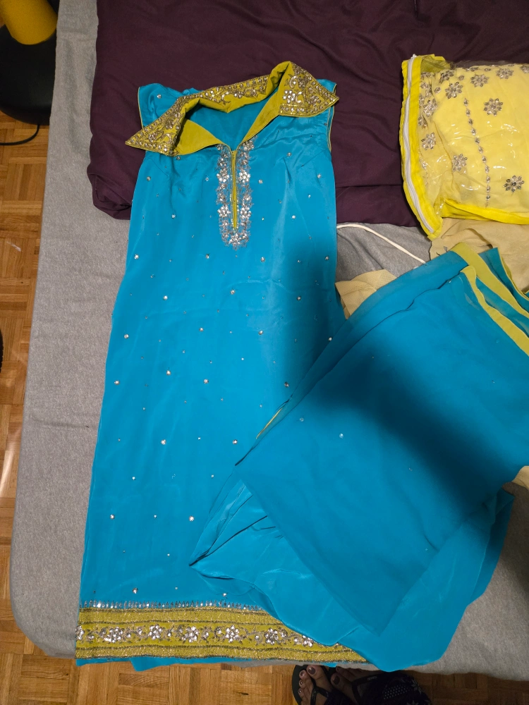 A lovely bright blue outfit, featuring a detailed collar. Detailed beading along the neck, sleeve and ankle regions. Matching pants are included. You can wear this for special occasions or gatherings, it is sure to make you feel wonderful.pick in north york Victoria and rowena dr.