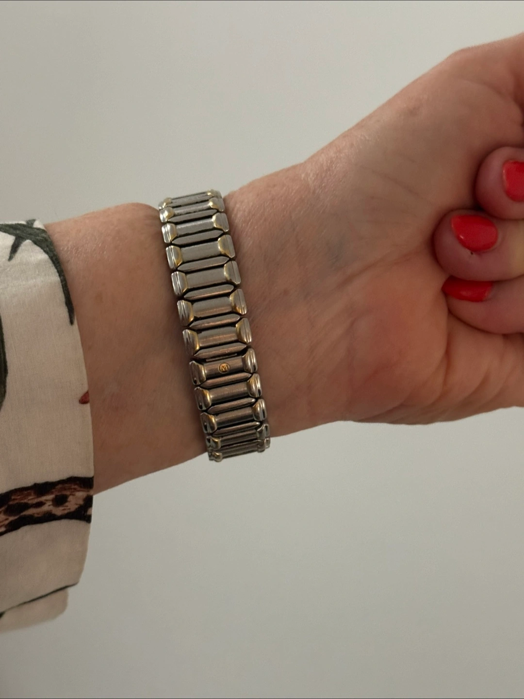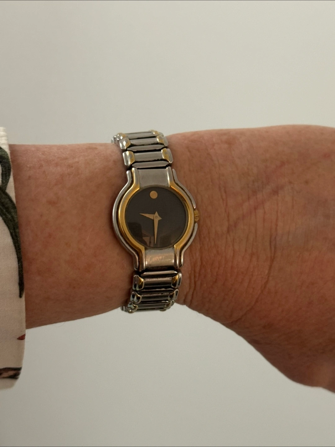 Classic Movado gold and stainless band with a black face. Needs a new battery Excellent working condition