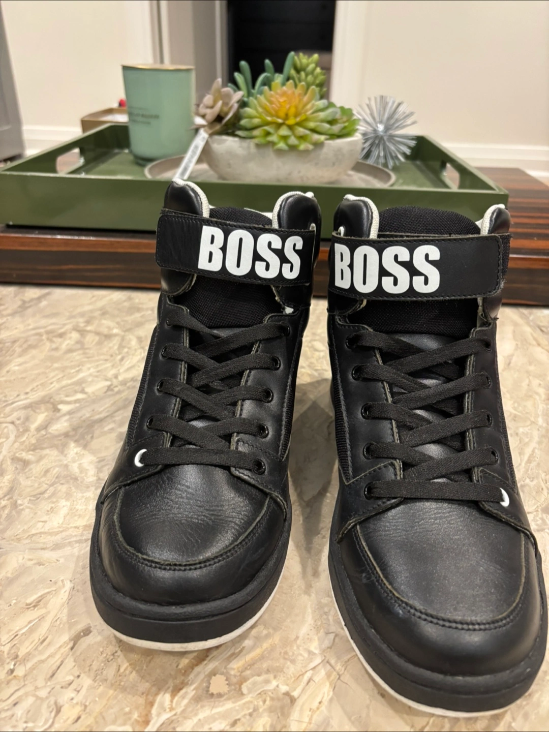 Black sneakers with a high-top design. Lace-up closure. A strap across the top. Perfect for a comfortable day out. ( Worn Once)