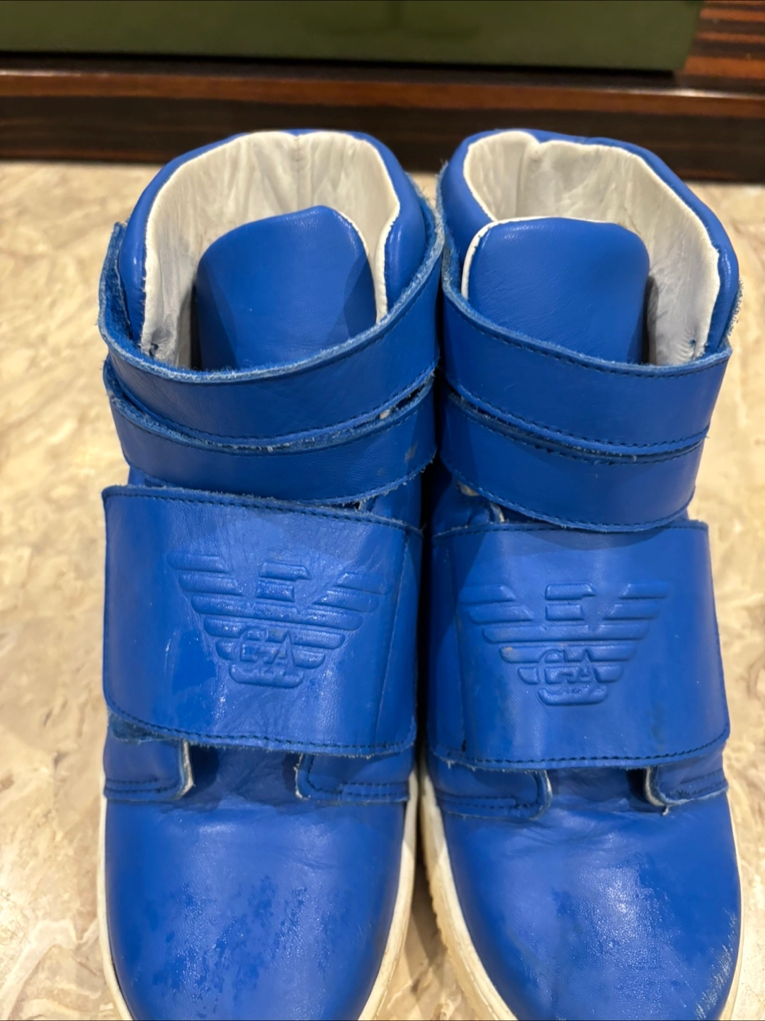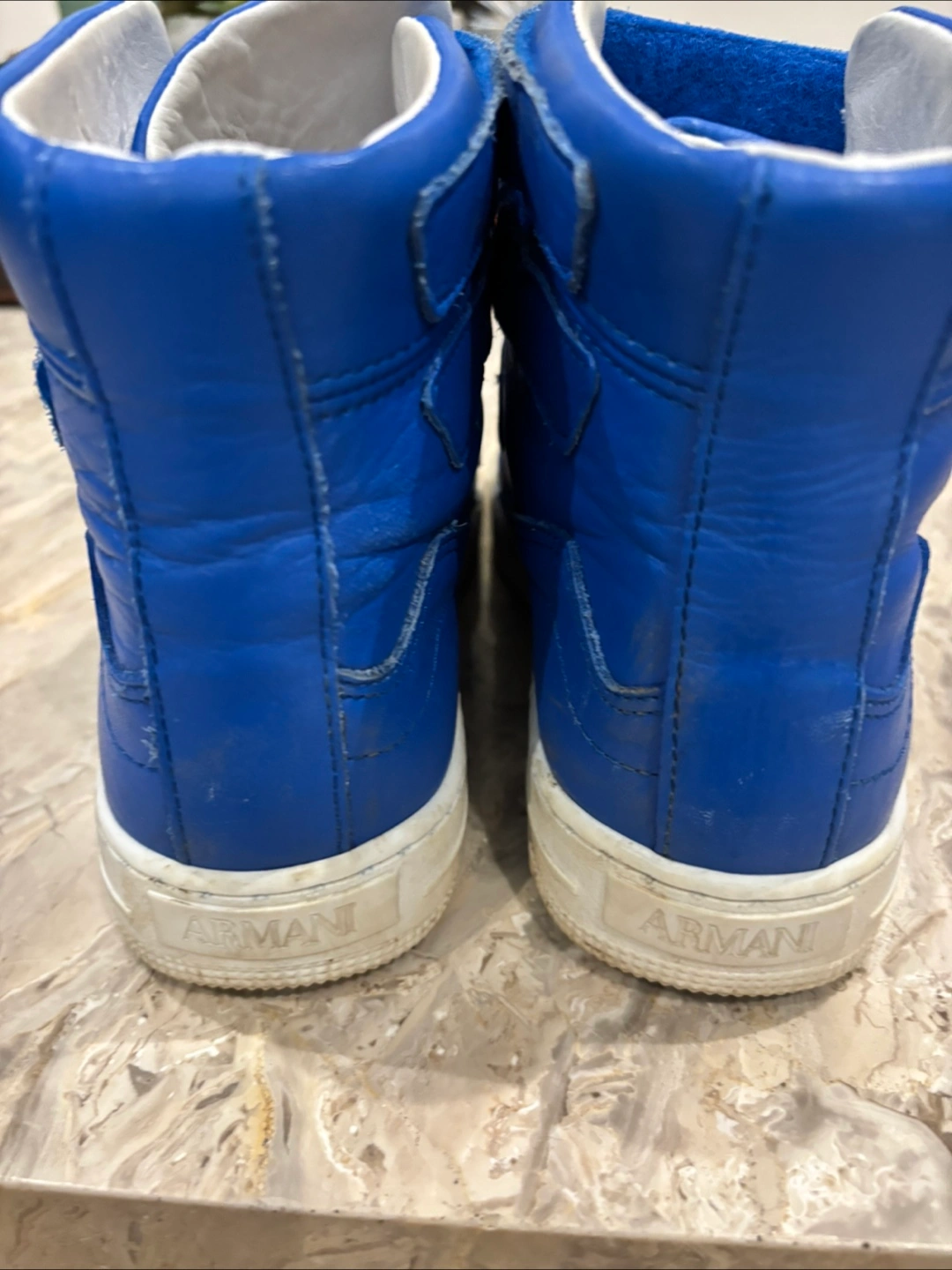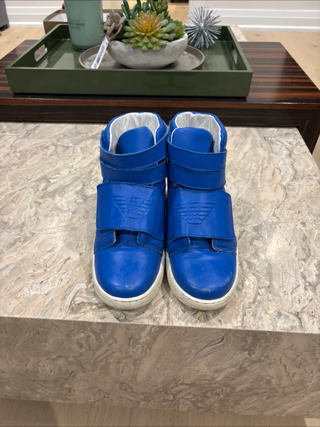Bright blue high-top sneakers. Feature velcro straps with brand logo. White soles. A wonderful shoe for any occasion. Like New except for scuffs in front) can be touched up.