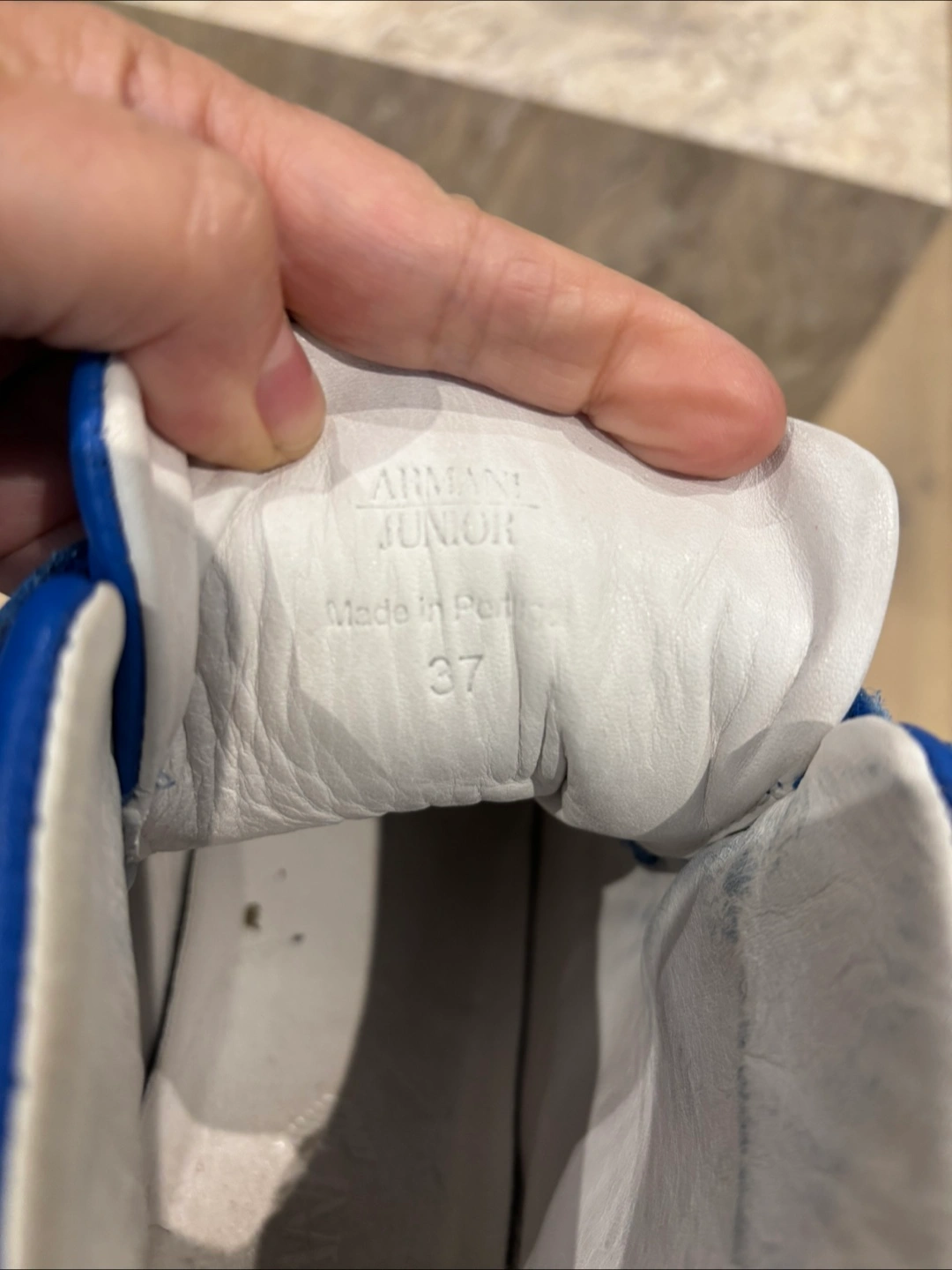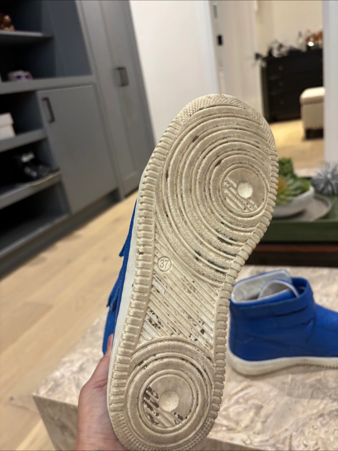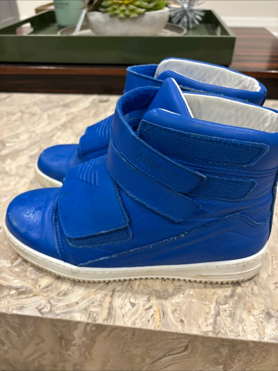 Bright blue high-top sneakers. Feature velcro straps with brand logo. White soles. A wonderful shoe for any occasion. Like New except for scuffs in front) can be touched up.